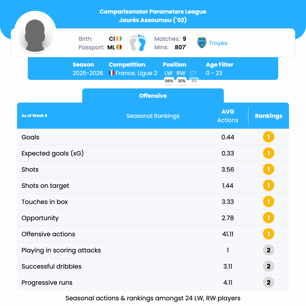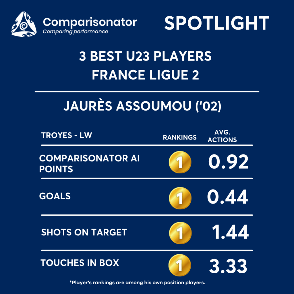 Jaurès Assoumou’s most notable strengths lie in his goal-scoring abilities, shot creation, and active participation in offensive actions, positioning him as a leader among his peers in these areas. His capacity to consistently convert opportunities into goals underscores his vital role in Troyes’ attacking strategies. Addressing his weaknesses in playmaking and dribbling could further elevate his performance, making him a more versatile and complete attacking player.