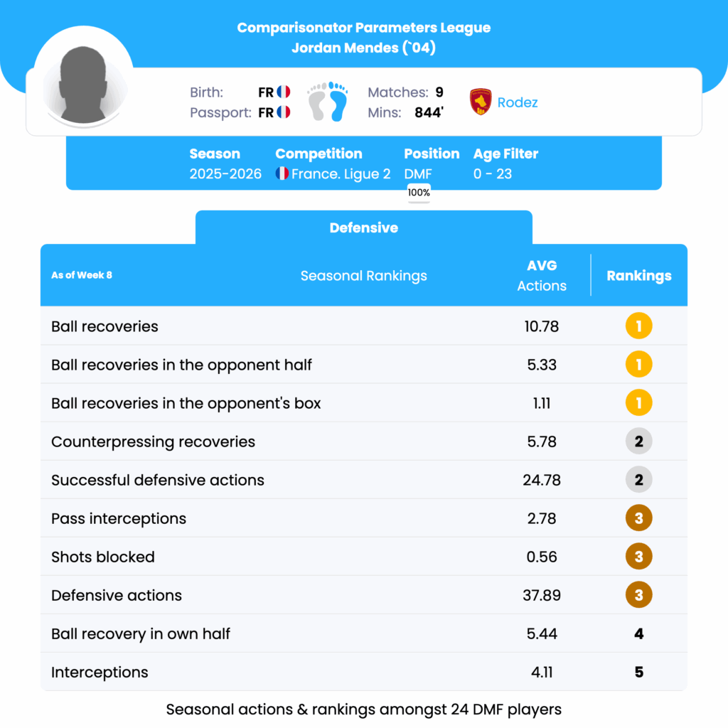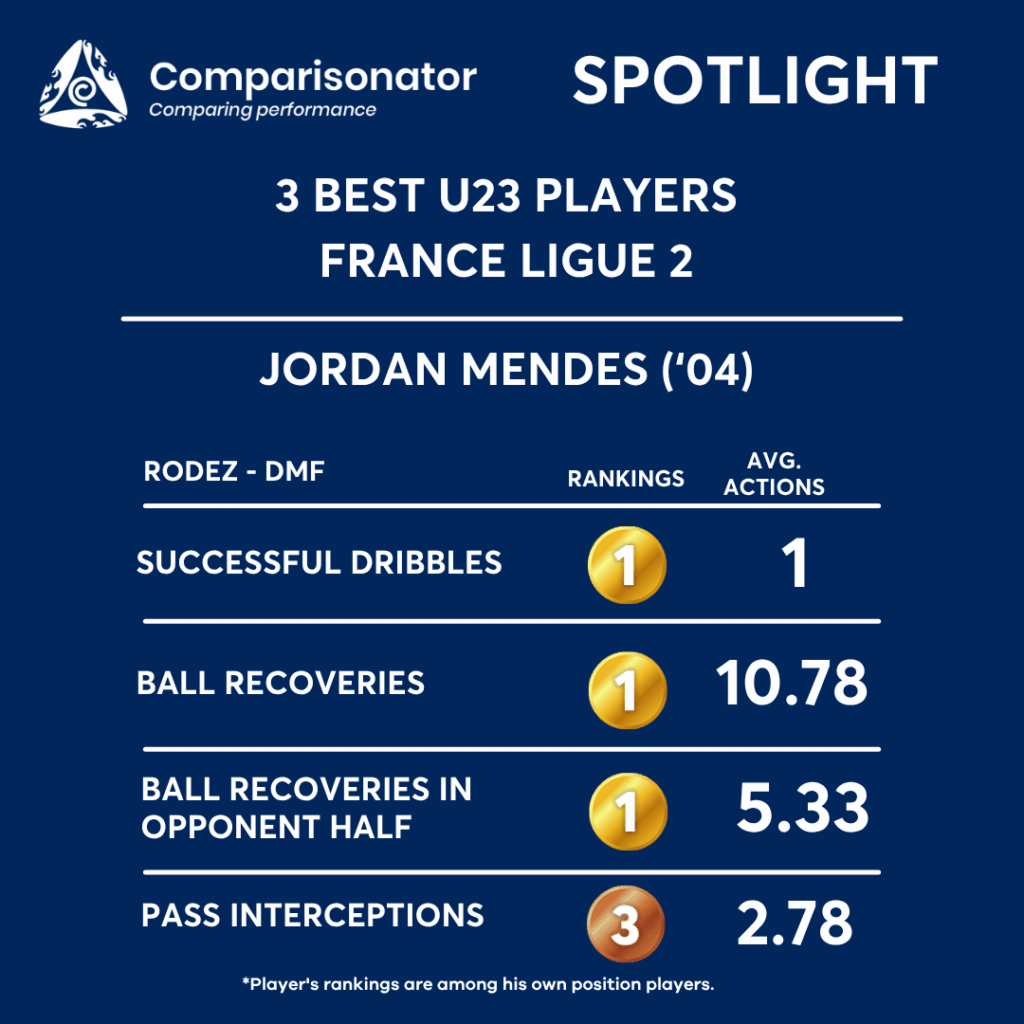 Jordan Mendes leads the rankings with an average of 10.78 ball recoveries per match, placing him first among 24 players in the same position. His ability to reclaim possession is unmatched, with Mattéo Veillon trailing slightly at 10.67. Mendes excels at regaining control, particularly in high-pressure situations, making him indispensable for disrupting opponent plays and initiating counter-attacks. With an average of 5.33 recoveries per match in the opponent’s half, Mendes again tops the rankings. This indicates his proactive approach and high pressing ability, crucial for teams employing an aggressive, forward-pushing strategy. His performance surpasses Yaël Mouanga, who averages 5 recoveries in the opponent’s half, showcasing Mendes’ effectiveness in transitional play.