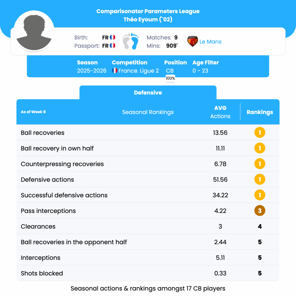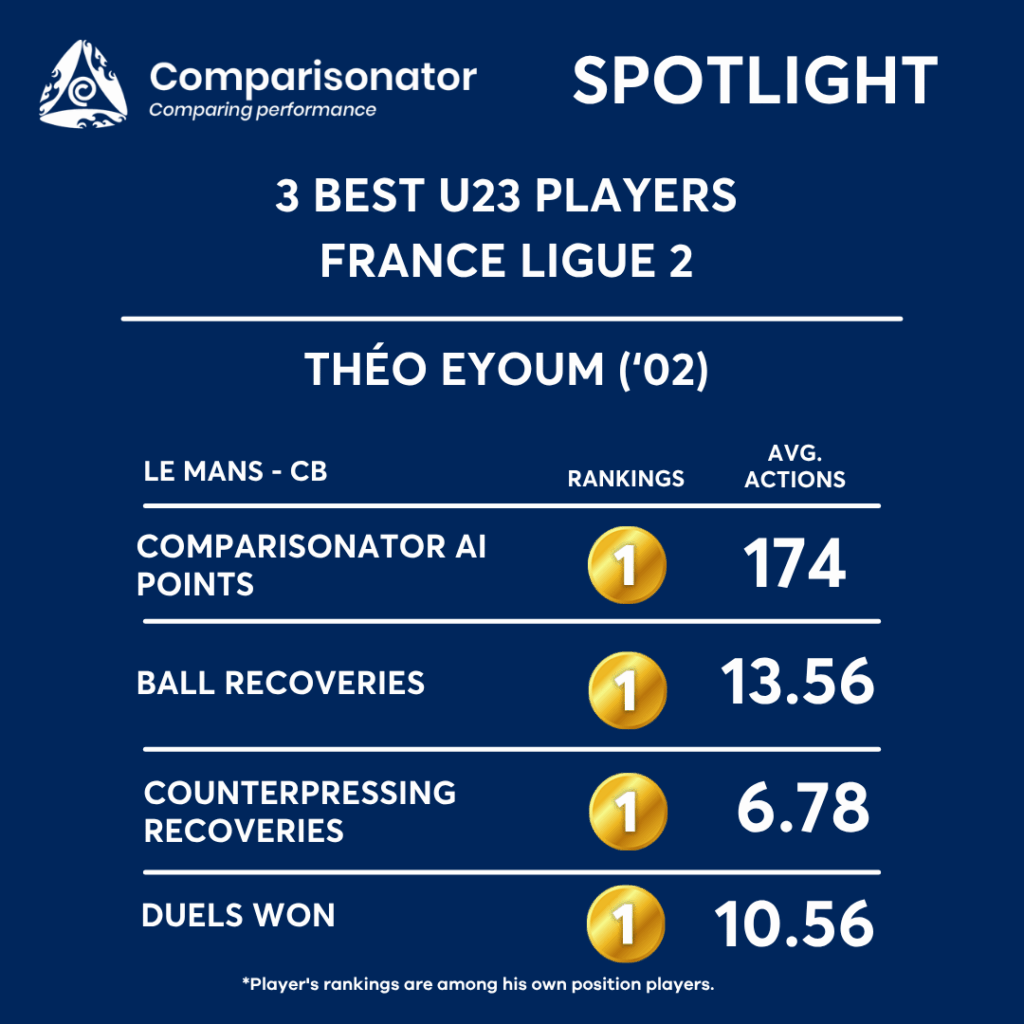 Théo Eyoum’s most notable strengths lie in ball recoveries, both overall and in his own half, counterpressing recoveries, defensive actions, and successful defensive actions, showcasing his robust defensive abilities. These strengths make him a pivotal figure in defensive setups, particularly ones that emphasize regaining possession and maintaining defensive solidity. However, areas such as interceptions in the opponent’s half, ball retention, and one-on-one defensive capabilities present opportunities for improvement to further enhance his overall performance.