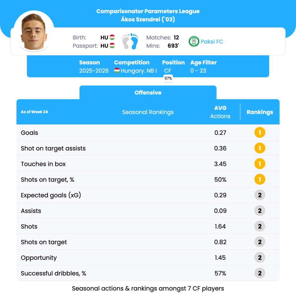 Szendrei ranks 1st out of 7 in Goals per match (0.27), tied with Zsombor Gruber, positioning him as the most productive scorer among U23 centre forwards. This output closely aligns with his xG of 0.29 (2nd/7), just below João Victor (0.31), indicating that his scoring is sustainable and chance-based rather than overperforming. Tactically, this suggests a forward who consistently arrives in high-value shooting zones and converts at a reliable rate. He leads the cohort 1st/7 in Touches in the box (3.45 per match), outperforming the next best Maxsuell Alegria (2.71). This underlines strong penalty-area positioning, timing of runs, and spatial awareness. Combined with his goal output, this makes him a credible reference point for structured attacking play, particularly against low blocks. Szendrei ranks 1st/7 in Shots on target percentage (50%), ahead of Gruber (44.44%). He also places 2nd/7 in Shots on target per match (0.82). This combination highlights a striker who may not shoot excessively but selects shots carefully, favoring accuracy over volume. From a tactical perspective, this supports using him as a finisher in well-constructed attacks rather than a high-volume shooter. He ranks 1st/7 in Shot on target assists (0.36 per match), tied with Maxsuell Alegria. While not a primary creator, this indicates an ability to set up teammates for high-quality shots, often through layoffs or short combinations in advanced areas.