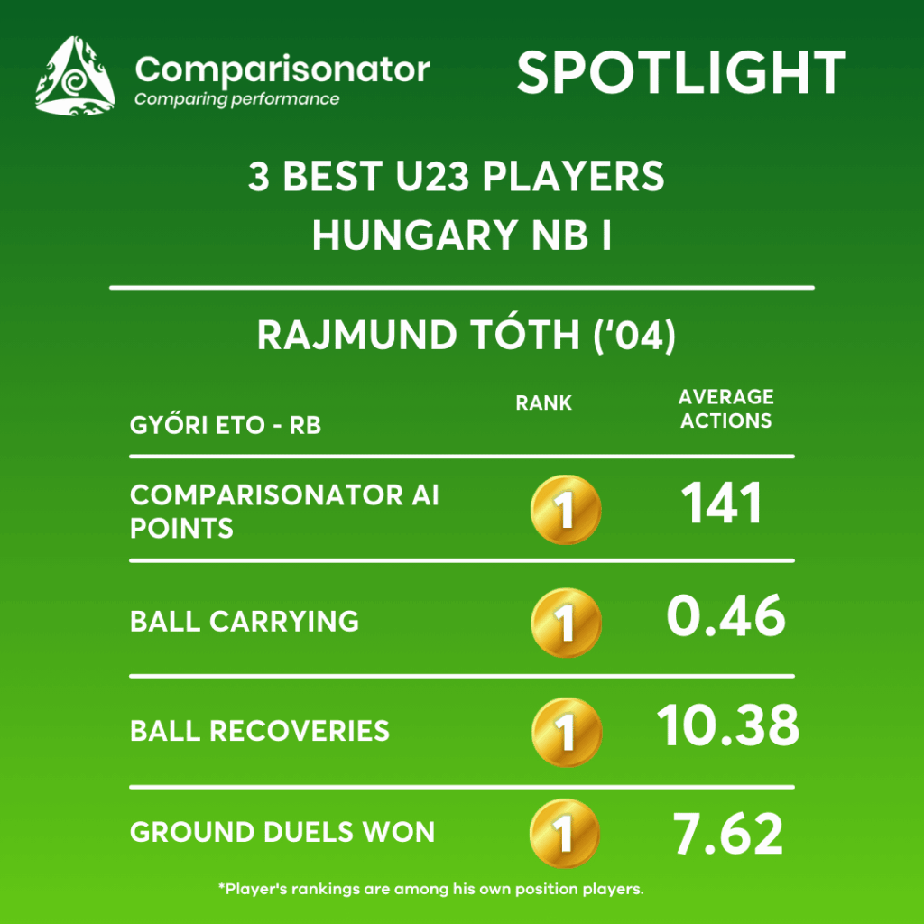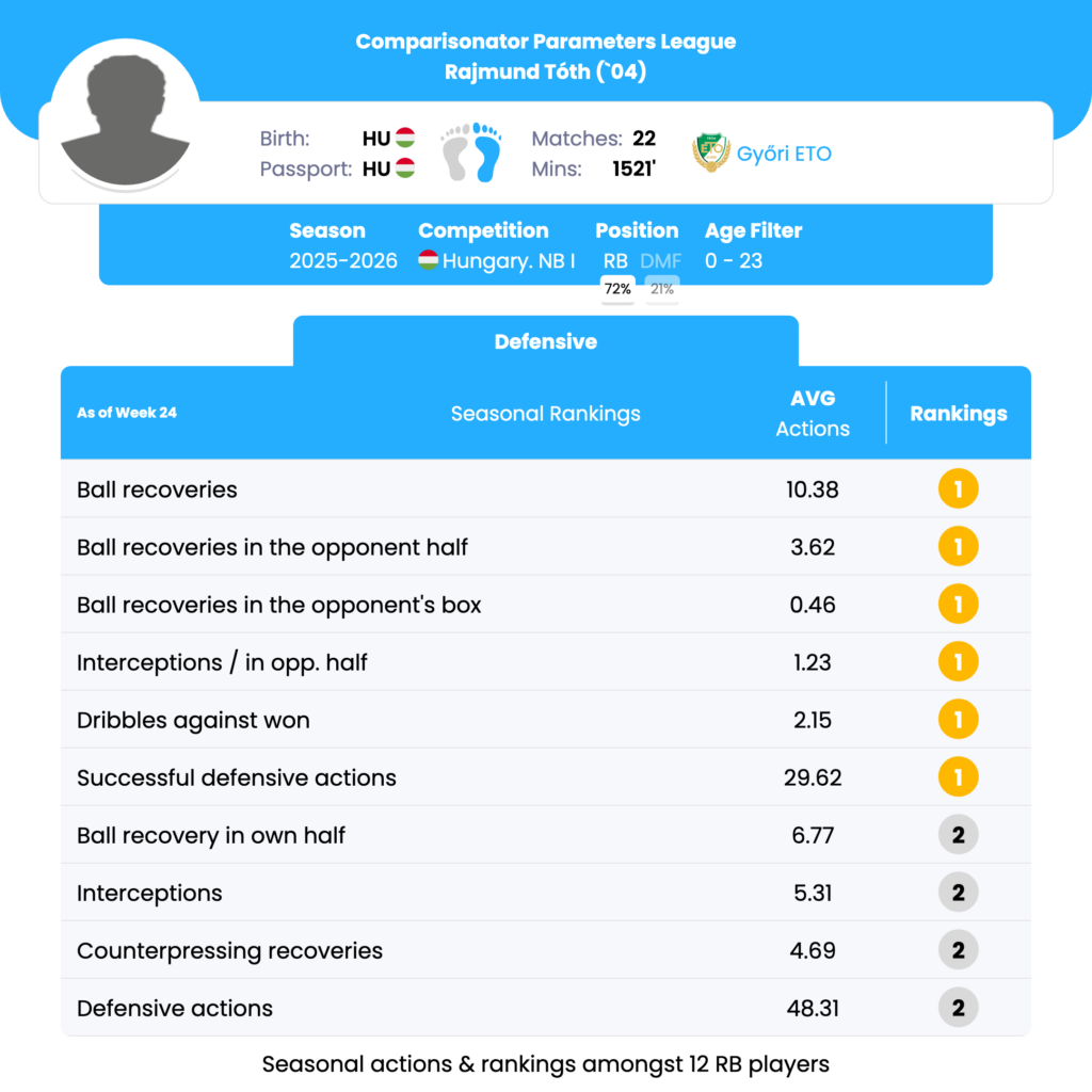 Rajmund Tóth’s standout seasonal strengths lie in ball recoveries (overall and in advanced zones), interceptions in the opponent half, dribbles against won, and successful defensive actions, where he consistently ranks 1st or 2nd among U23 right-backs. His profile reflects a high-intensity, proactive defensive full-back who thrives in pressing-oriented systems and aggressive territorial defense.