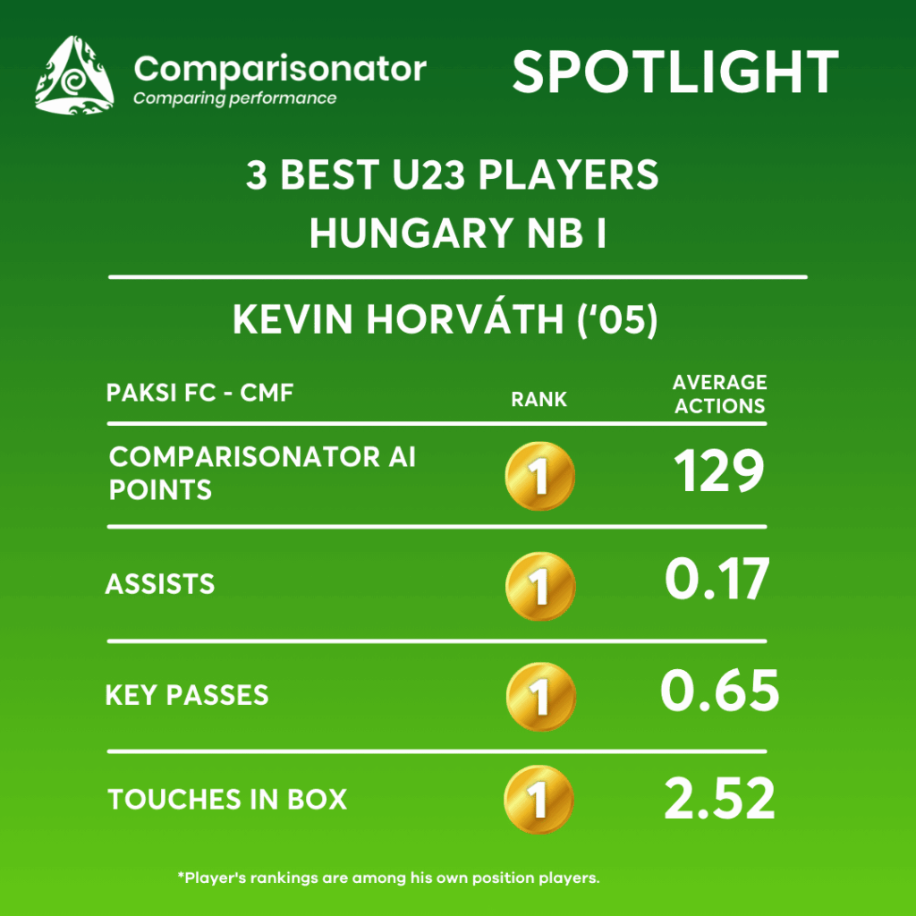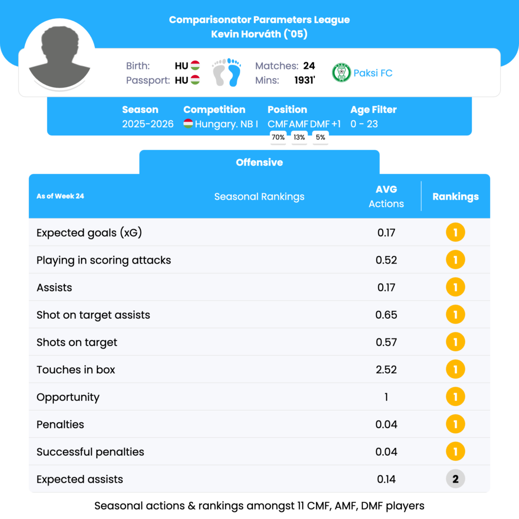 Kevin Horváth’s strongest seasonal rankings are in expected goals (1st), playing in scoring attacks (1st), assists (1st), shot on target assists (1st), touches in the box (1st), and opportunity creation (1st) among under‑23 midfielders in Hungary NB I. His profile highlights a midfielder who actively enters the box, contributes directly to chance creation, and maintains high involvement in decisive attacking phases.