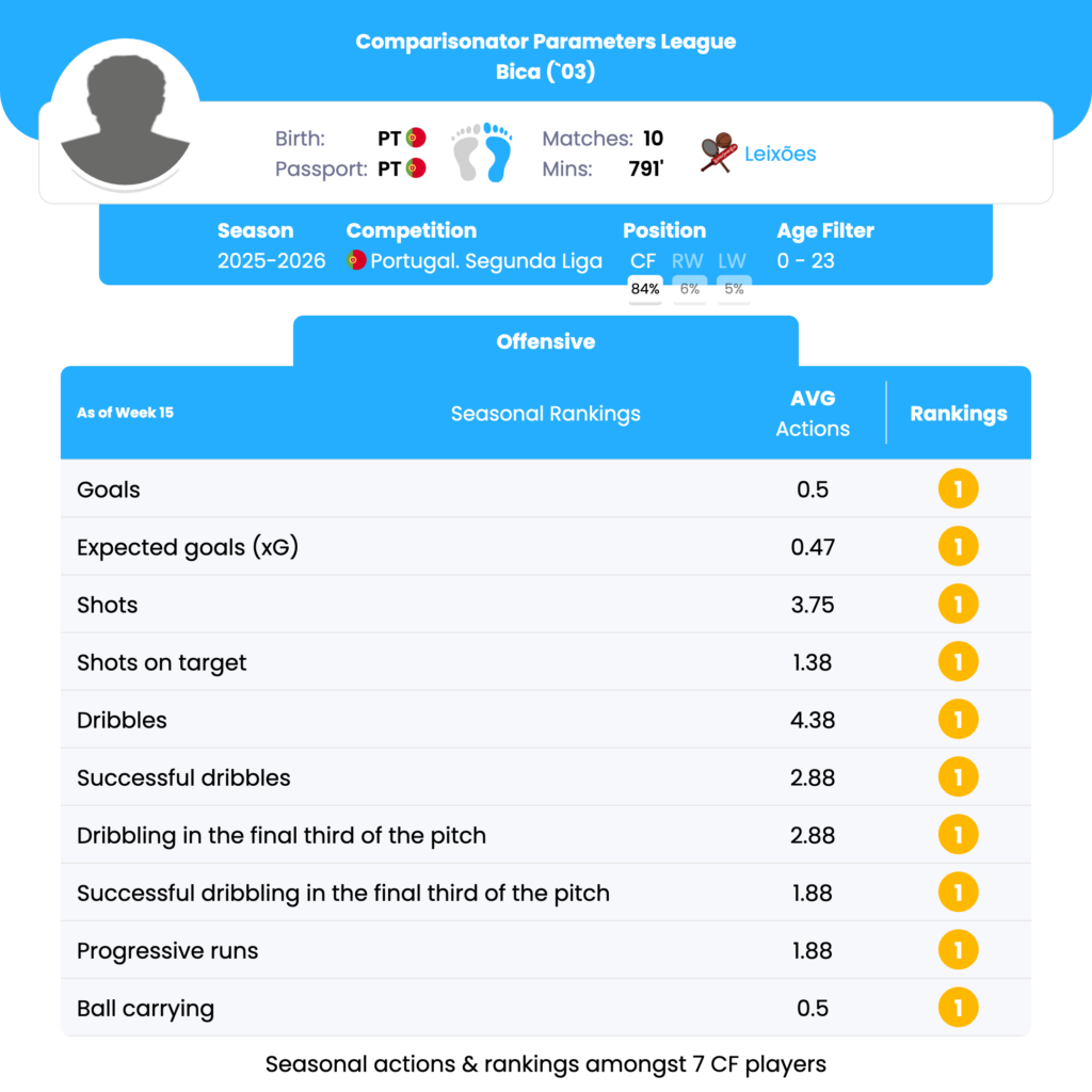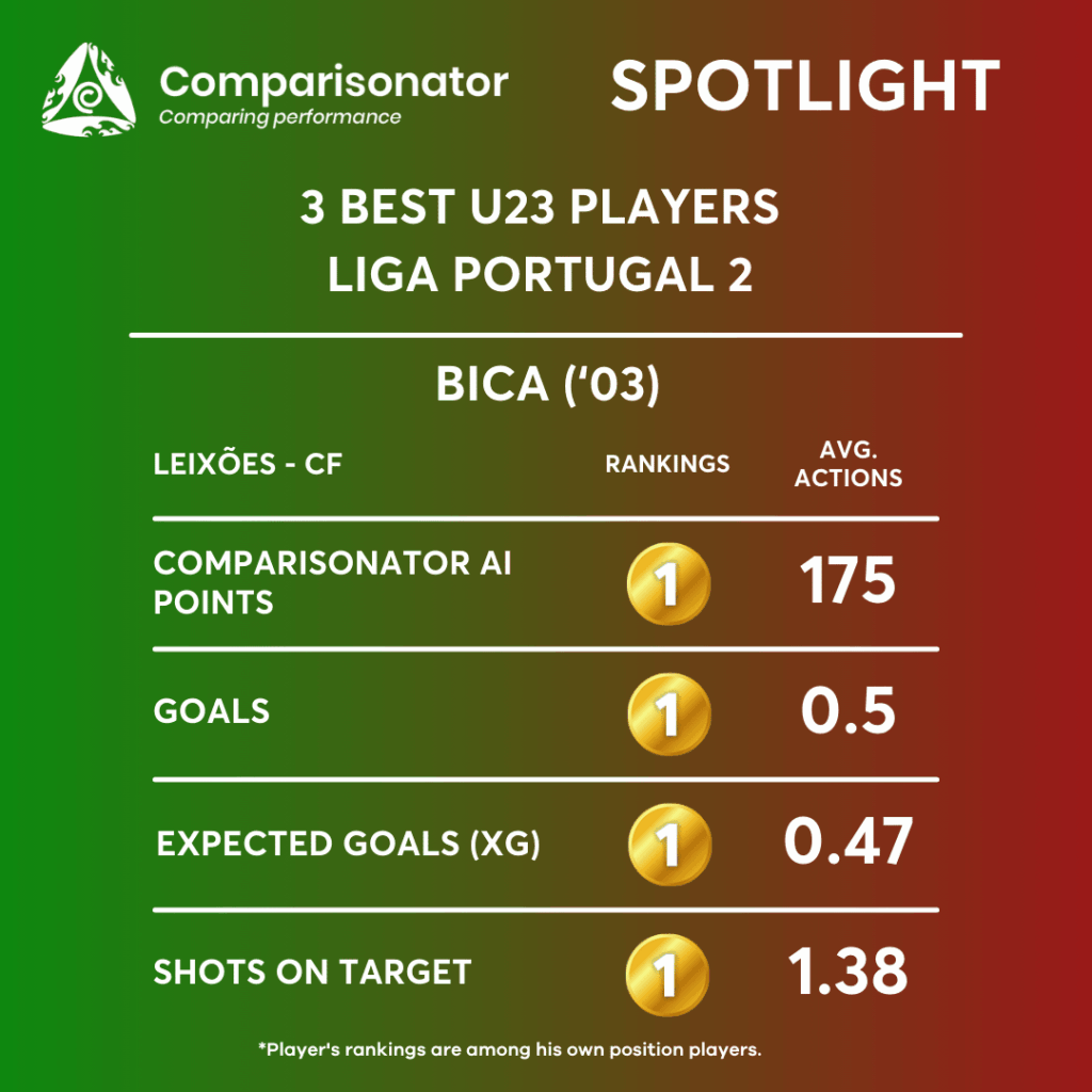 Bica’s strengths as a center forward lie in his goal-scoring ability, shooting efficiency, and dynamic dribbling skills, positioning him as a formidable offensive asset. His best ranking parameters include goals, expected goals (xG), shots, and dribbles. However, to maximize his potential, focusing on improving his assist capabilities and conversion rates can be beneficial for his development and tactical utilization in team strategies.