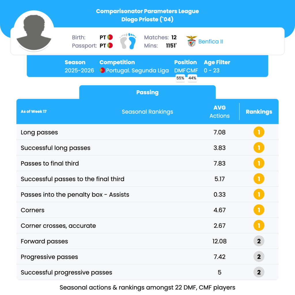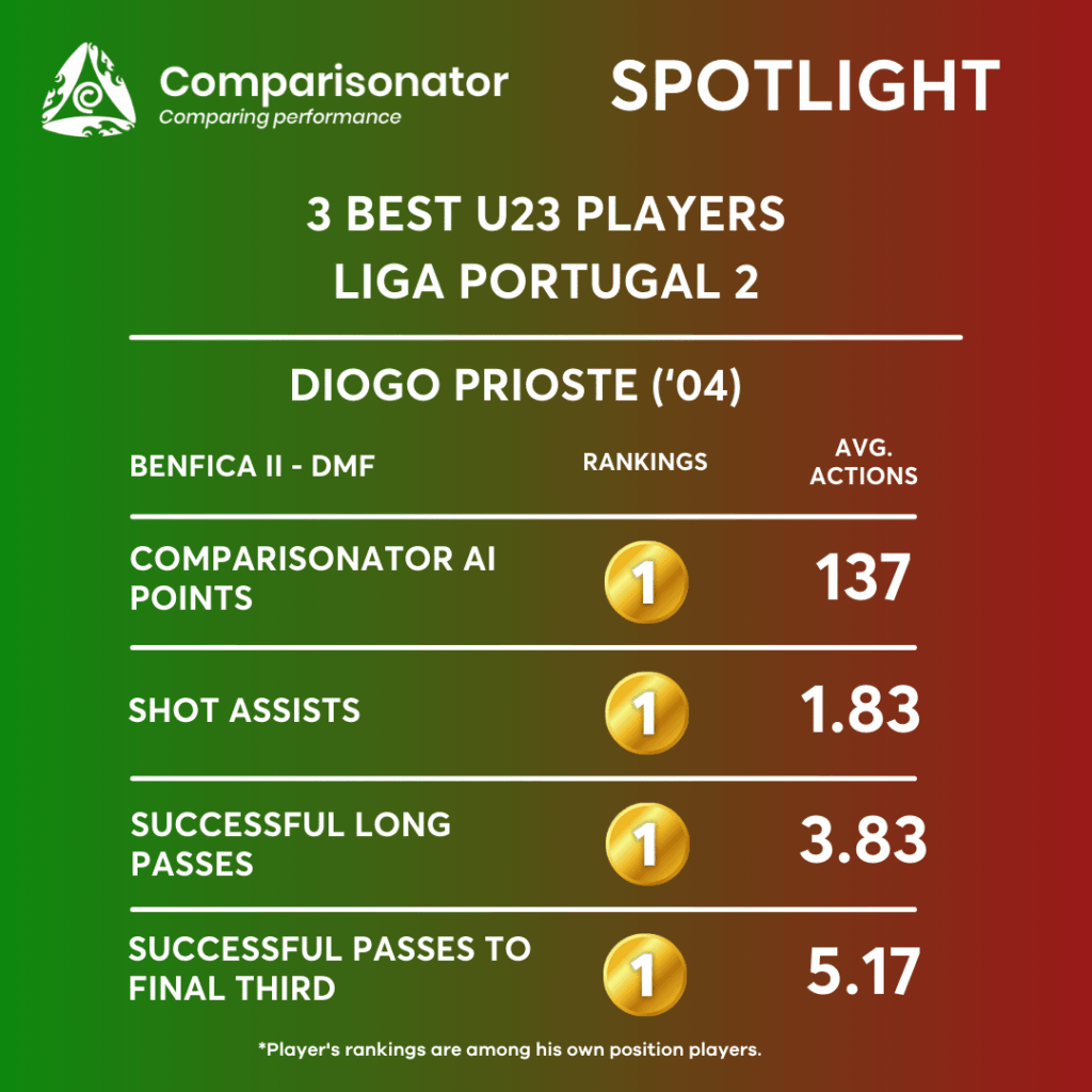 Diogo Prioste’s best ranking parameters lie in his long passes, passes to the final third, corners, passes into the penalty box leading to assists, and forward passes. These strengths highlight his crucial role in transitioning play and creating offensive opportunities. Addressing weaknesses such as key passes, long pass accuracy, progressive passes, short pass accuracy, and crossing ability may further enhance his overall effectiveness and tactical impact on the field.