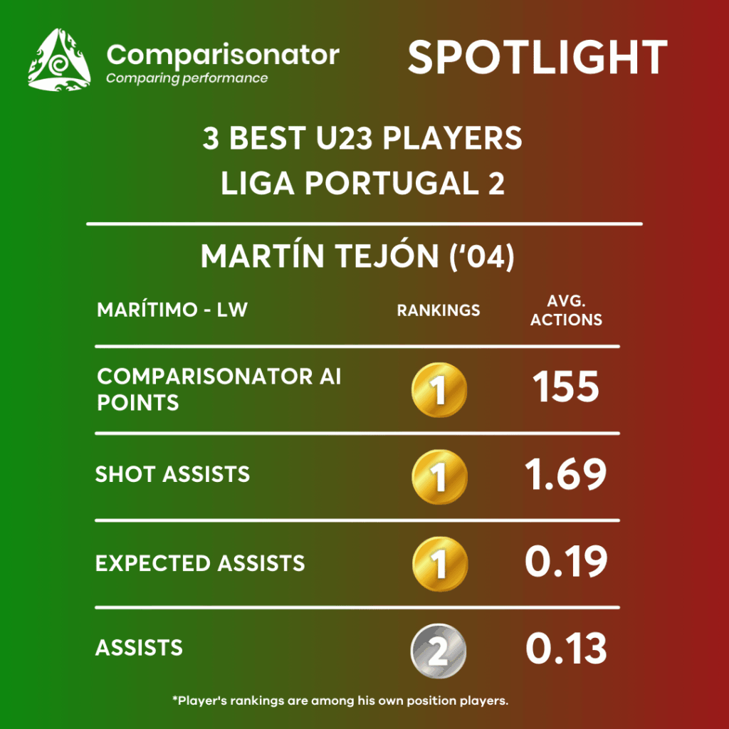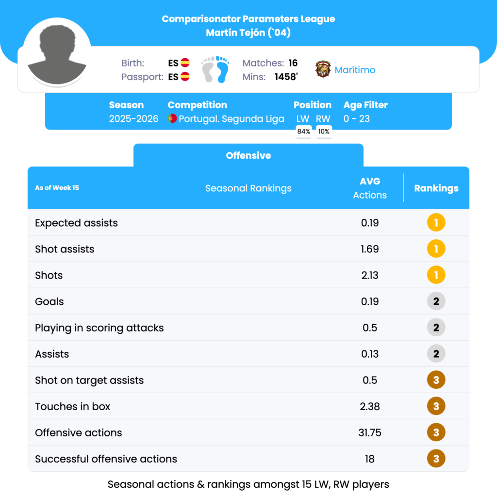 Tejón is a standout performer, ranking 1st in expected assists (0.19 per match) and shot assists (1.69 per match). These figures underscore his ability to create scoring opportunities and serve as a critical playmaker for his team. He surpasses Manuel Mendonça in expected assists (0.11) and Simão Silva in shot assists (1.0), highlighting his proficiency in setting up teammates for attempts on goal. Tactically, this suggests he may be most effective when deployed in roles where he can exploit space to deliver key passes and orchestrate the attacking phase. With 2.13 shots per match, Tejón ranks 1st among his peers, just ahead of Ivan Lima (2.09). This indicates his aggressive play style and capacity to consistently test the goalkeeper, suggesting he could be utilized as a primary attacking threat from the wings, cutting inside to capitalize on shooting opportunities.