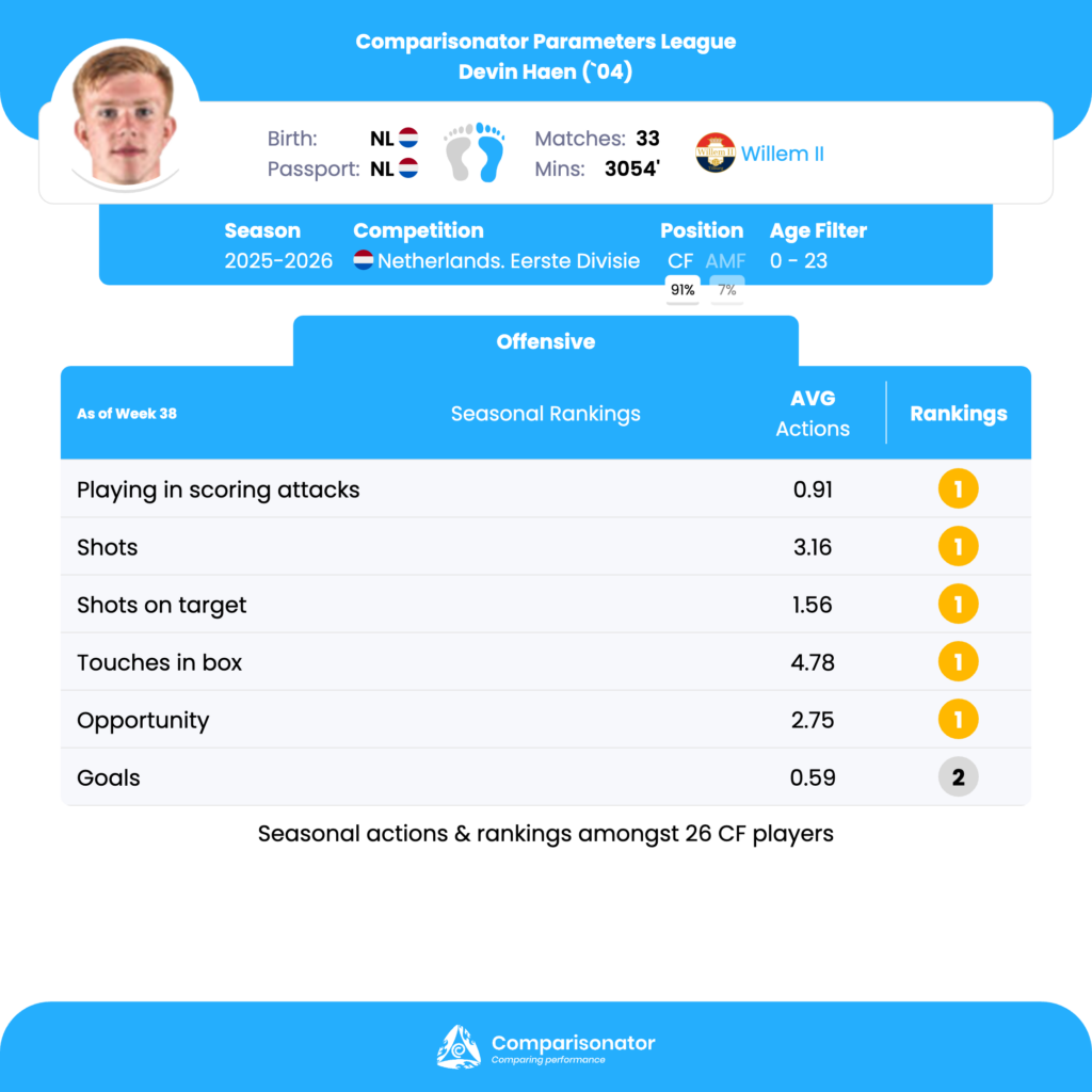 Devin Haen’s most notable strength is his direct goal threat. He ranks 1st out of 26 for Playing in scoring attacks with 0.91 per match, just ahead of B. Boersma (0.89). He also ranks 1st out of 26 for Shots with 3.16 per match, ahead of Rafik El Arguioui (2.54), and 1st out of 26 for Shots on target with 1.56 per match, ahead of B. Boersma (1.42). This profile points to a striker who is consistently involved in attacking sequences and finishes them with volume. Tactical value: he can be used as the main reference forward in teams that generate repeated box entries and want a high-volume shooter who regularly forces goalkeeper actions. His box presence is also elite. Haen ranks 1st out of 26 for Touches in box with 4.78 per match, above B. Boersma (4.05), and 1st out of 26 for Opportunities with 2.75 per match, ahead of Jesper Uneken (2.38). He is also 2nd out of 26 for Goals at 0.59 per match, behind Robin van Duiven (0.64), and 2nd out of 26 for Expected goals (xG) at 0.56 per match, behind B. Boersma (0.65). This combination suggests strong penalty-box timing, reliable positioning, and a repeatable ability to arrive in dangerous zones. Haen also shows a solid all-around offensive involvement layer beyond pure finishing. He ranks 2nd out of 26 for Successful offensive actions, % with 62.25, behind Adam Tahaui (64.39), and 3rd out of 26 for Successful offensive actions with 16.75 per match, behind Adam Tahaui (18.29) and Rafik El Arguioui (17.15). He is 4th out of 26 for Shot on target assists at 0.41 per match and 4th out of 26 for Offensive actions at 26.91 per match. This indicates more than a pure box finisher; he can participate in the attacking phase with enough consistency to support combination play.