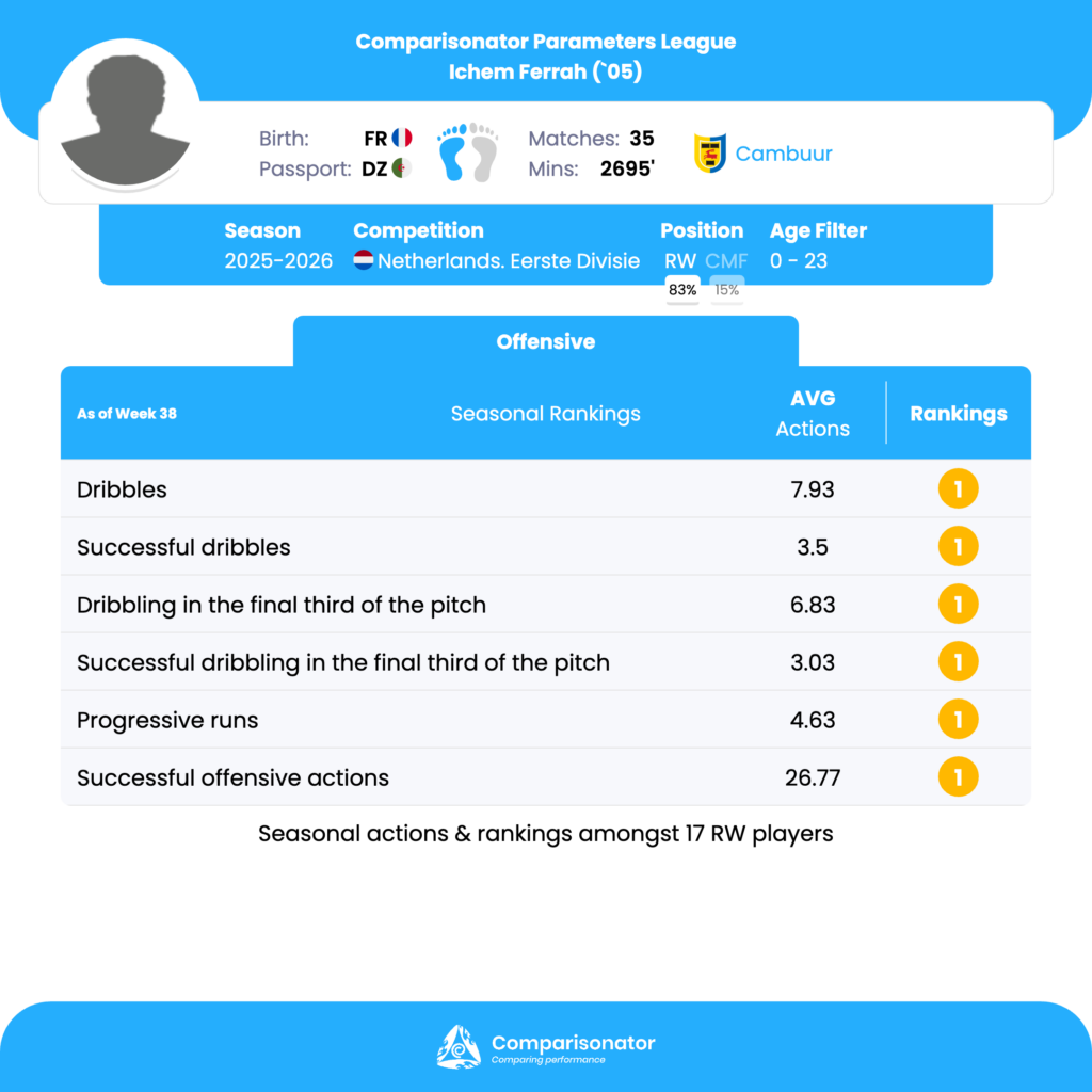 Ferrah’s best ranking parameters are clearly tied to dribbling volume, progressive runs, final-third carrying, shot on target assists, and overall offensive activity, where he repeatedly places 1st in the league-wide under-23 RW sample. He combines high involvement with real attacking impact, especially as a ball carrier and wide creator. The main limitations are his dribbling success rate, which trails the best performers significantly, plus some middling efficiency in shooting and conversion.