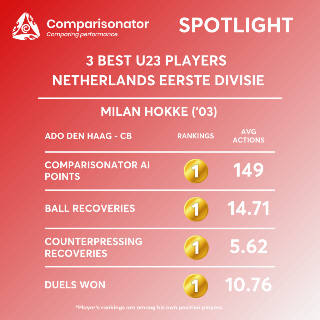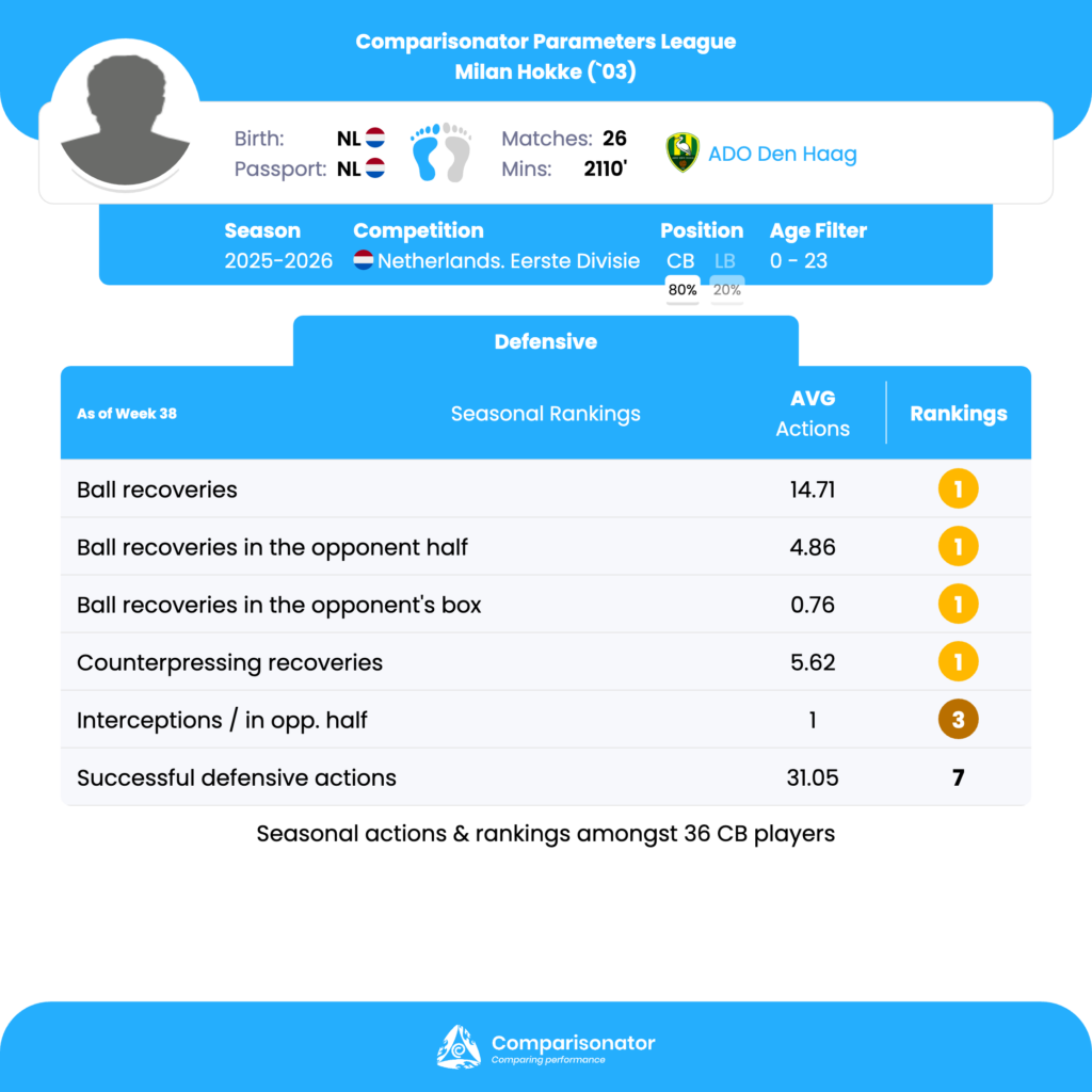 Milan Hokke’s biggest seasonal strength is his ball-winning volume and advanced recovery activity. He ranks 1st out of 36 CBs under 23 with 14.71 ball recoveries per match, ahead of Ismaël Baouf (14.14). He is also 1st out of 36 for ball recoveries in the opponent half with 4.86, ahead of J. Plug (3.64), and 1st out of 36 for ball recoveries in the opponent’s box with 0.76, ahead of Nick Twisk (0.63). On top of that, he leads the group in counterpressing recoveries with 5.62 per match, ahead of Nick Twisk (5.13). This profile points to a centre-back who is highly active in stepping into pressure, recovering second balls, and helping his team win the ball high up the pitch. Tactically, that makes him valuable for an aggressive defensive line, pressing structures, and possession-based teams that want centre-backs to secure territory quickly after losing the ball. A second major strength is his ability to contribute in the opponent half through defensive actions rather than pure deep defending. He ranks 3rd out of 36 for interceptions in the opponent half with 1.00 per match, behind Finn Dicke (1.07) and F. Merién (1.04). This supports the idea that he reads higher-field defensive moments well and can anticipate passing lanes when his team is pressing. Combined with his top rankings in recoveries, this suggests a defender who is comfortable defending forward and participating in collective pressure rather than only protecting the box.
