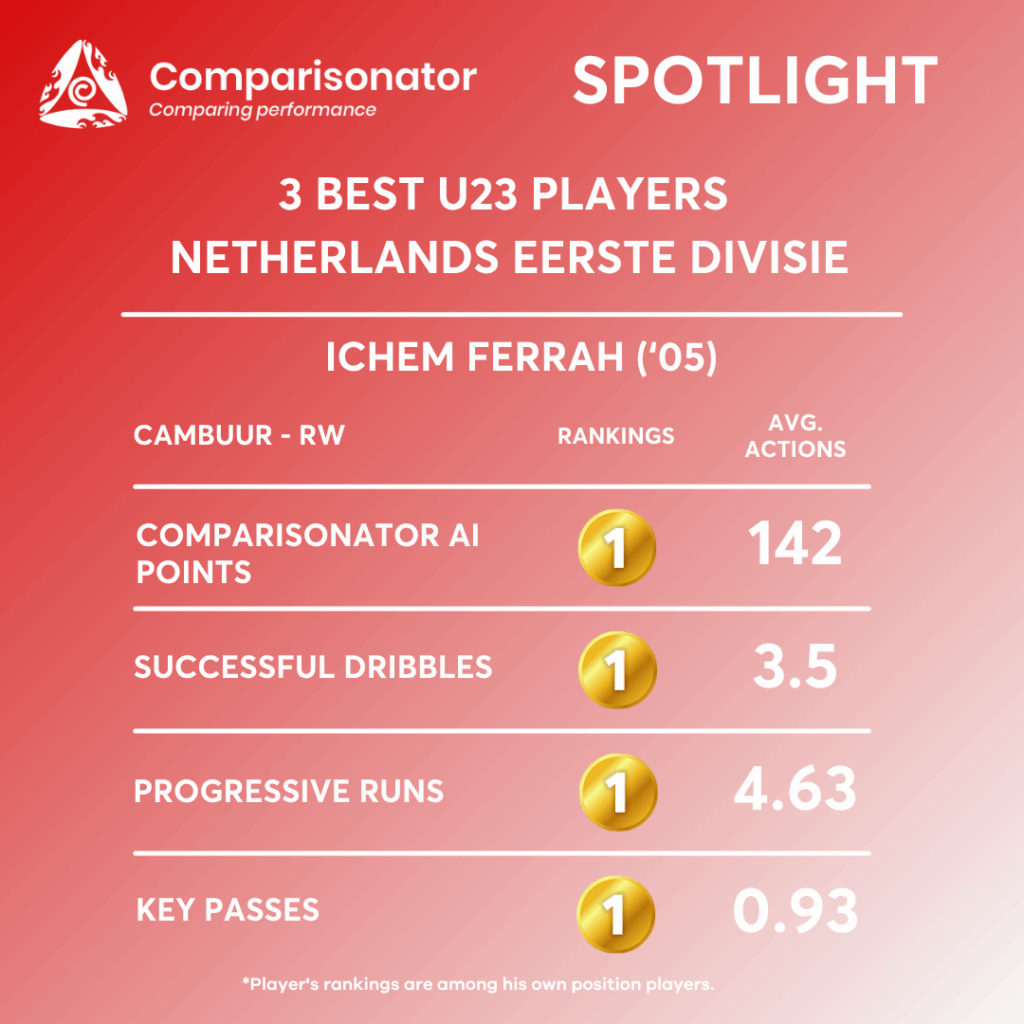 Ferrah’s standout strength is his 1st-place output in ball progression and dribbling volume. He ranks 1st out of 17 in Dribbles (7.93), Successful dribbles (3.5), Dribbling in the final third (6.83), Successful dribbling in the final third (3.03), Progressive runs (4.63), Shot on target assists (0.93), Offensive actions (44.6), and Successful offensive actions (26.77). These numbers place him above the closest challengers, such as D. O’Niel, M. Bahaty, and Tay Abed. This suggests a winger with very strong 1v1 capacity, constant forward intent, and a high volume of productive attacking involvement. Tactically, he can be a major outlet on the flank in transition-heavy or isolation-based attacking structures, where repeated carrying and progressive actions can stretch the opponent’s defensive line. He also stands out as a reliable creator from wide areas. Ferrah is 2nd out of 17 in Shot assists (1.33), Opportunity (1.93), Penalties (0.03), and Successful penalties (0.03). He is very close to the leaders in each of these categories, especially in shot assists where he shares the top number with F. Kluit, and in opportunity creation where he is just behind Jasper Hartog. This shows that his dribbling is not just for show; it regularly leads to final actions and chances. Ferrah also performs well as an attacking finisher for a winger. He ranks 3rd out of 17 in Expected goals (0.32), Playing in scoring attacks (0.87), Expected assists (0.16), Shots (2.67), and Shots on target (1.03). While not the top number in these areas, he remains close to the leaders Tay Abed, Jasper Hartog, and F. Kluit. This indicates that he is not only a carrier but also a real end-product threat. He can be trusted to arrive in scoring zones and sustain pressure on the opponent’s back line.