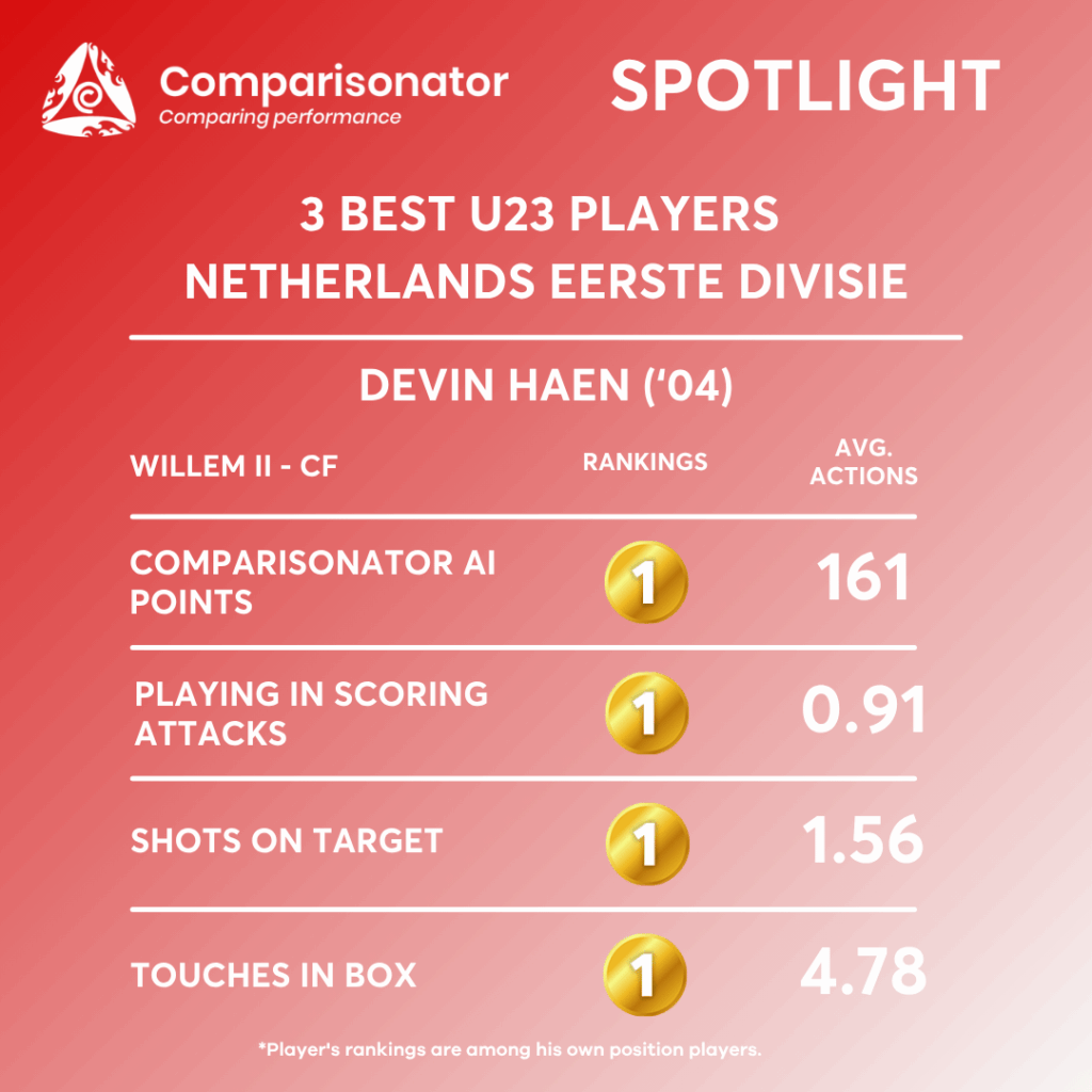 Devin Haen’s strongest seasonal indicators are his shots, shots on target, touches in box, scoring-attack involvement, opportunities, goals, and xG, all of which place him near the top of the under-23 CF group. The profile is that of a high-volume, box-oriented centre forward with strong positioning and reliable goal threat. His main limitations are in chance creation, assist output, and 1v1 progression, where he remains useful but not elite compared with the category leaders.
