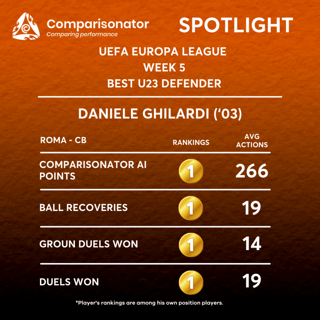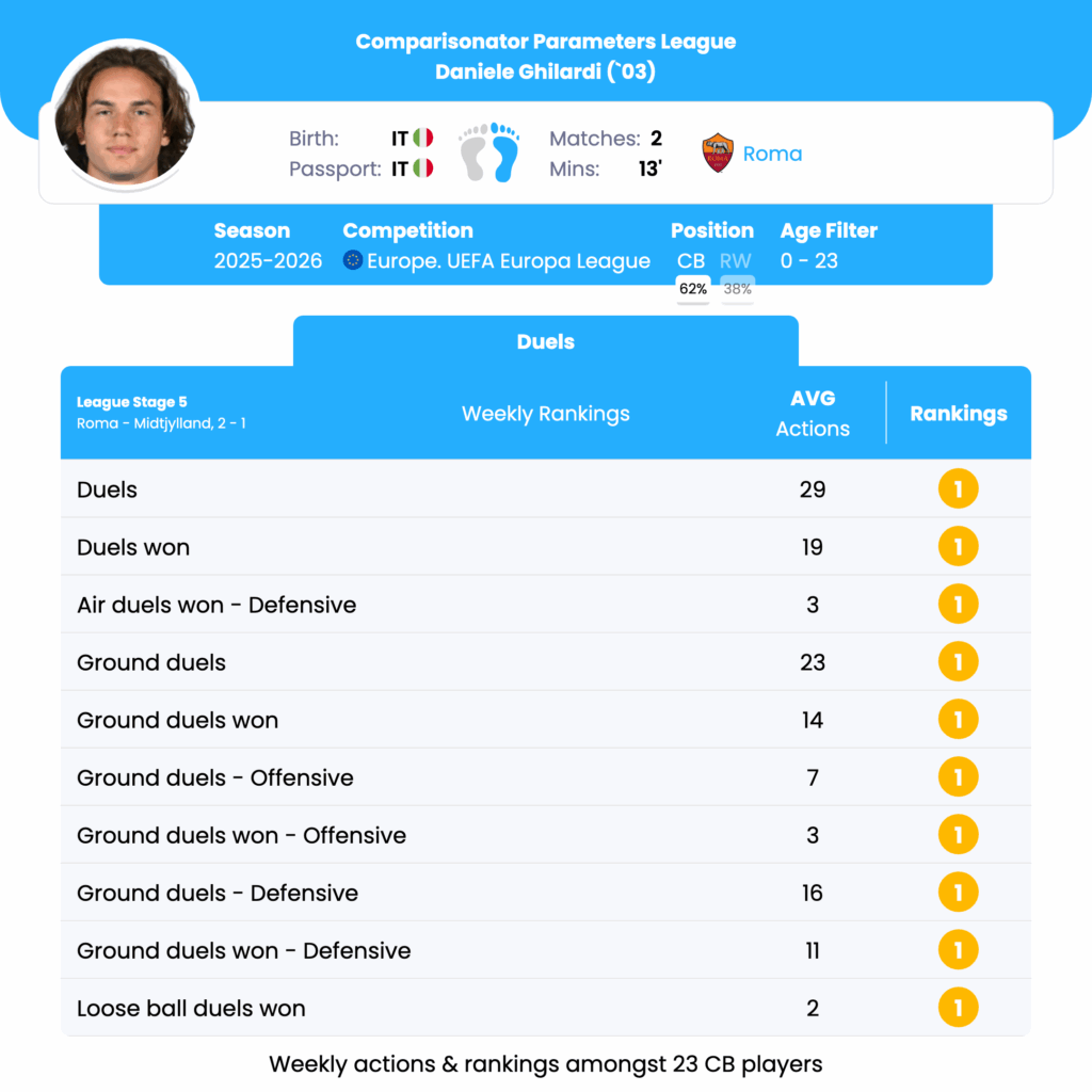 Daniele Ghilardi’s strongest parameters in the selected match include total duels, ground duels, and defensive ground duels, where he consistently ranked first among his peers under 23. His ability to win duels, both total and ground, highlights his tactical significance in Roma’s defensive setup, providing the team with a reliable presence capable of disrupting opposition attacks and maintaining possession. While his offensive aerial capability may require improvement, his overall contribution to defensive duels positions him as a formidable player in Roma’s strategy, emphasizing his role in solidifying their defensive line.