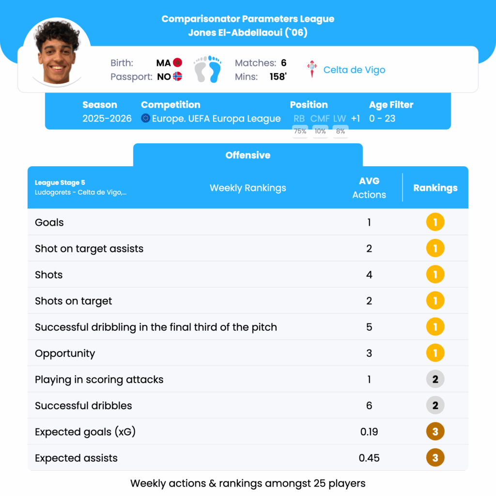 Jones El-Abdellaoui’s performance in the selected match against Ludogorets was marked by his leadership in several offensive parameters. His ability to score, assist shots on target, create opportunities, and execute successful dribbles in the final third highlights his tactical significance in Celta de Vigo’s attacking strategy. These strengths suggest that El-Abdellaoui may be a key player in driving the team’s offensive initiatives, leveraging his skills to maximize scoring chances and maintain pressure on opposing defenses.