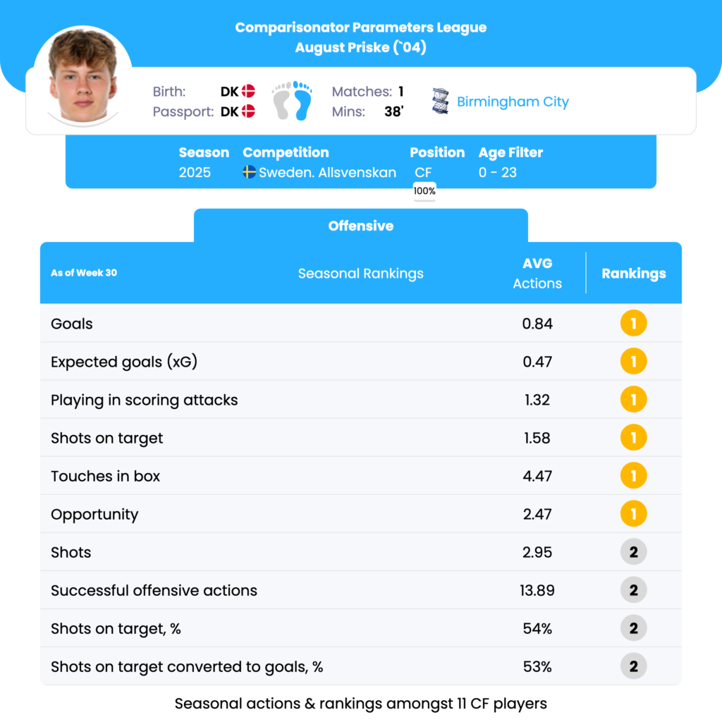 August Priske’s standout seasonal strengths are his league-leading goal output (0.84), xG dominance (0.47), and top-ranked box activity metrics, all within the U23 CF group. His efficiency in shot accuracy and conversion further supports a profile built around decisive finishing.