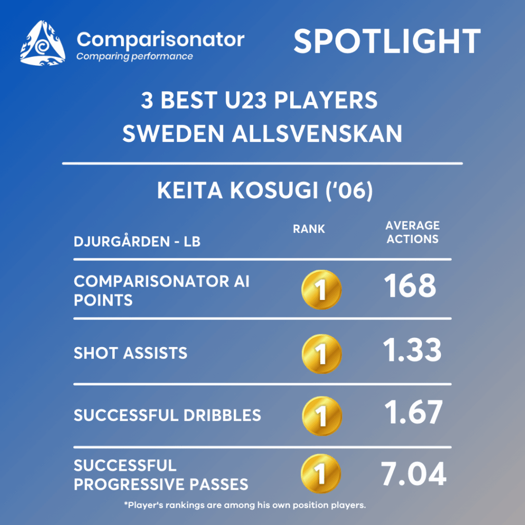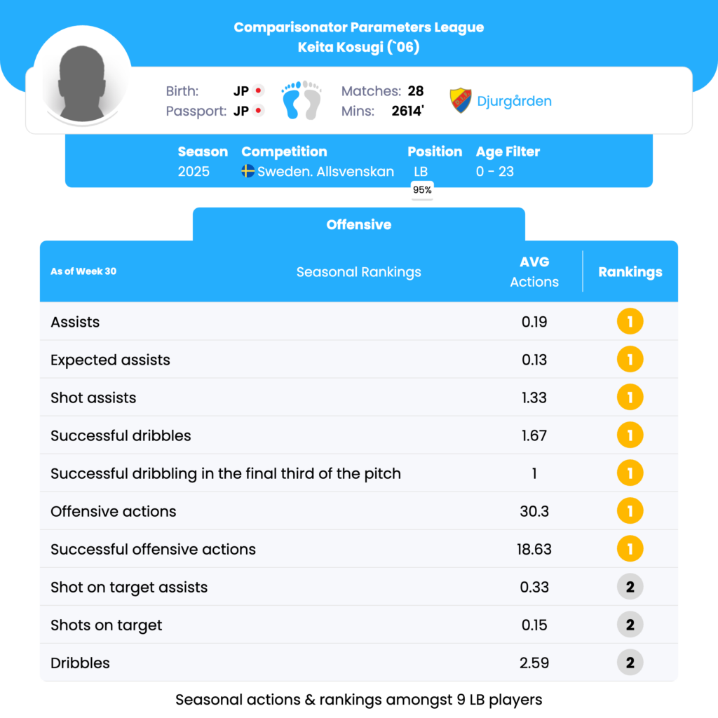Keita Kosugi’s strongest seasonal rankings come in assists, expected assists, shot assists, offensive actions, successful offensive actions, and successful dribbles, where he consistently ranks 1st among under-23 left backs in the Allsvenskan. These metrics highlight a fullback who excels in chance creation, ball progression, and sustained offensive involvement.