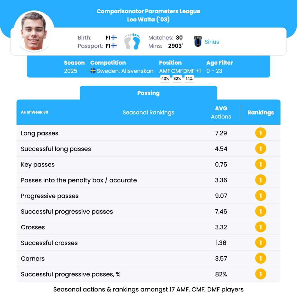 Leo Walta’s strongest seasonal rankings come in Long passes, Successful long passes, Progressive passes, Successful progressive passes, Key passes, Crosses, and Corners, all ranking 1st out of 17 among U23 peers in his positions. His profile reflects a high-impact, aggressive passer with elite progression and delivery volume. The main constraints appear in passing efficiency, forward pass success rate, and assisting chain output, which may influence how he is deployed tactically. Overall, he profiles as a midfielder who can drive attacking structure through passing volume and progression, particularly in systems that embrace controlled risk.