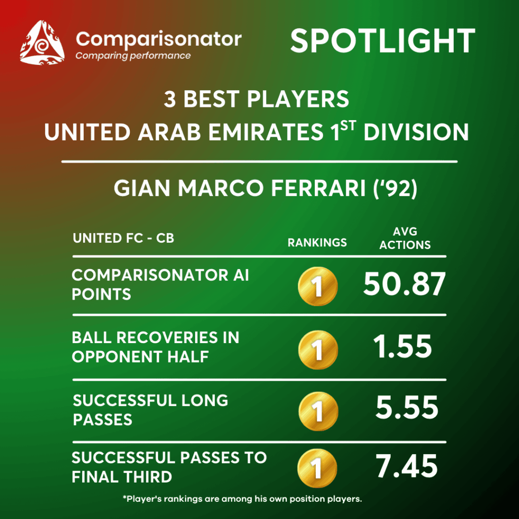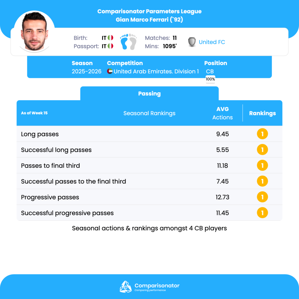 Ferrari ranks 1st out of 4 CBs for both long passes attempted (9.45) and successful long passes (5.55) per match. The next closest player, L. Johan Fer, records 4.71 long passes and 2.86 successful long passes. This gap highlights Ferrari as the clear long-distribution leader among centre-backs. Tactically, this indicates strong capacity to bypass pressure blocks, switch play, or find advanced targets directly from the back line. His profile fits teams that rely on vertical access or diagonal switches during early build-up. Ferrari leads all CBs in passes to the final third (11.18) and successful passes to the final third (7.45) per match, ranking 1st out of 4. The closest competitor, Othman Jamal, averages 5.00 and 3.36 respectively. This shows Ferrari as a primary territorial progressor, capable of consistently breaking midfield lines with passing rather than carrying. From a tactical perspective, this can support positional-play models where centre-backs are expected to connect directly with advanced midfielders or wide players. Ferrari records 12.73 progressive passes and 11.45 successful progressive passes per match, both ranking 1st out of 4, alongside a 90% progressive pass success rate, again best in position. Compared to Othman Jamal (8.45 progressive passes, 79.57% success), Ferrari combines volume and security. This suggests strong decision-making under pressure and technical consistency, making him reliable for sustained dominance phases and controlled progression.