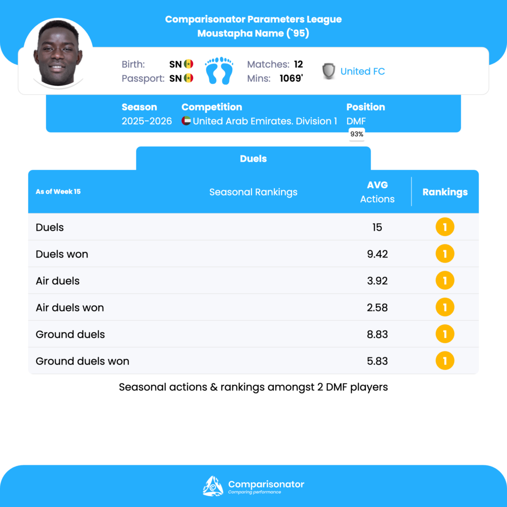 Moustapha Name’s strongest parameters are total duels, duels won, ground duels (especially defensive), aerial duel volume, and overall duel involvement, where he consistently ranks 1st among DMFs in the league. His profile points toward a physically dominant, contact-heavy defensive midfielder who can anchor the midfield, win first and second balls, and stabilize defensive phases.