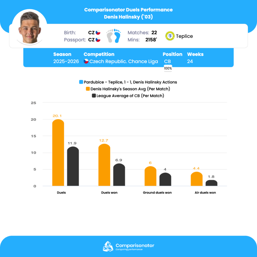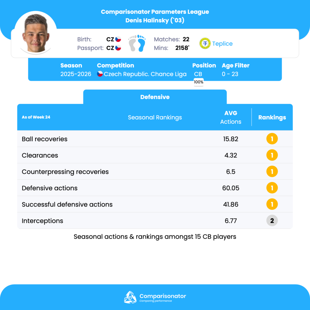 Halinsky ranks 1st out of 15 in several core defensive activity metrics. He averages 15.82 ball recoveries per match, with 13.82 recoveries in his own half, both the best figures among U23 centre-backs. The closest competitor, Ondrej Kricfalusi, trails clearly behind in both areas. This profile indicates a defender who is constantly involved around his defensive zone, with strong anticipation and positional awareness. Tactically, this may fit well in teams that defend for longer phases and rely on centre-backs to stabilize second balls and loose possessions. Halinsky leads the cohort with 4.32 clearances per match, ranking 1st out of 15. This indicates strong box-defending instincts and the ability to manage pressure situations near goal. This strength can be valuable in matches where the team concedes territory and faces sustained aerial or direct pressure. With 60.05 defensive actions and 41.86 successful defensive actions per match, Halinsky again ranks 1st out of 15. These numbers slightly exceed Kricfalusi, the nearest competitor. This suggests not only volume but also effectiveness, pointing toward a centre-back who is frequently engaged and generally successful in duels, blocks, and recoveries. From a tactical perspective, he may suit systems that expose central defenders to repeated defensive scenarios, such as lower-block or mid-block structures.