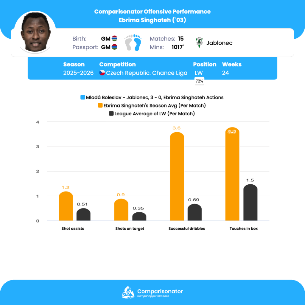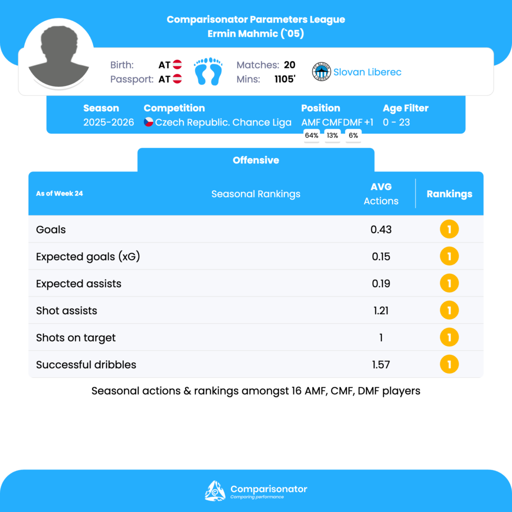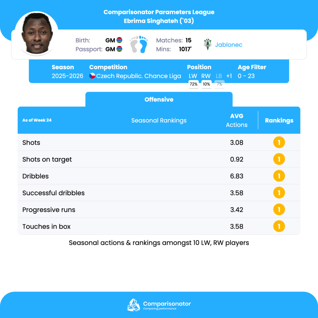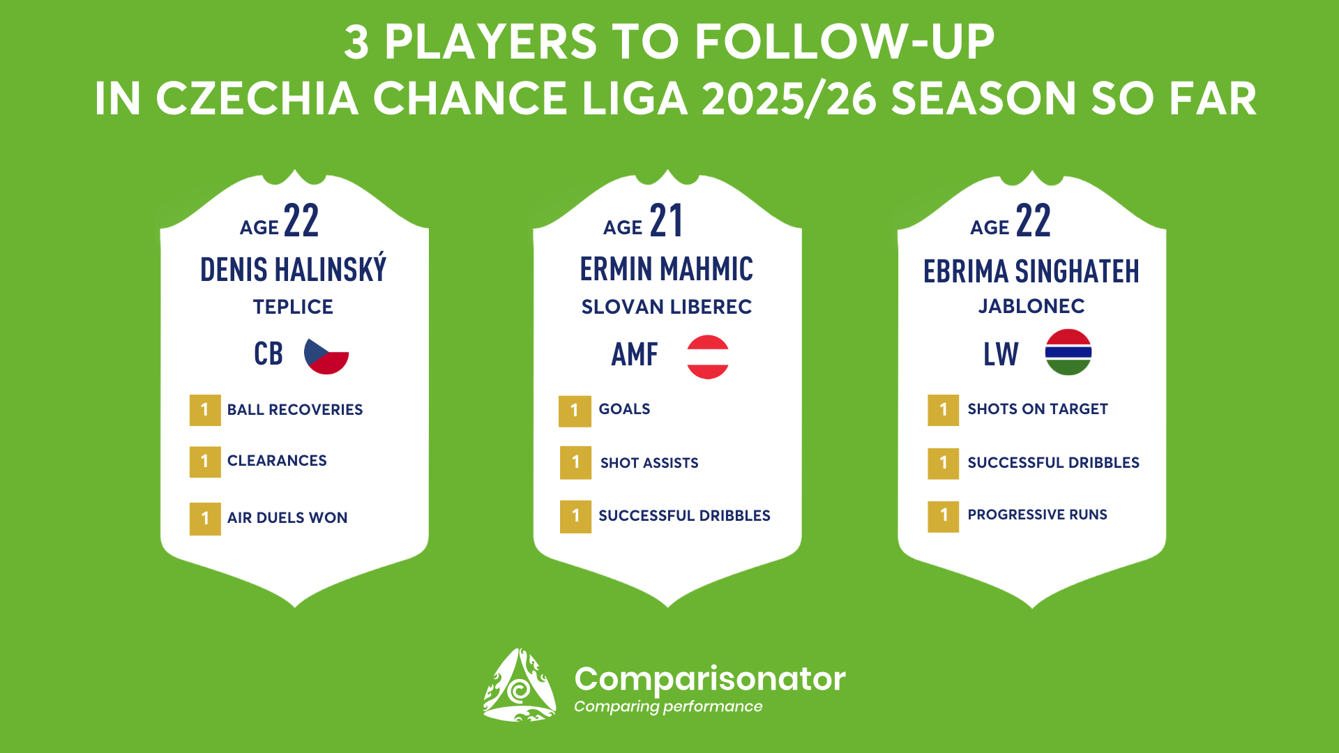 As the 2025/26 Czechia Chance Liga season progresses, several young talents are making their mark. Here are three standout U23 players who have been turning heads with their performances. Denis Halinsky from Teplice, Ermin Mahmic from Slovan Liberec and Ebrima Singhateh from Jablonec are analyzed based on data from Comparisonator platform. Their impressive statistics highlight their influence on the pitch and their potential for future success.