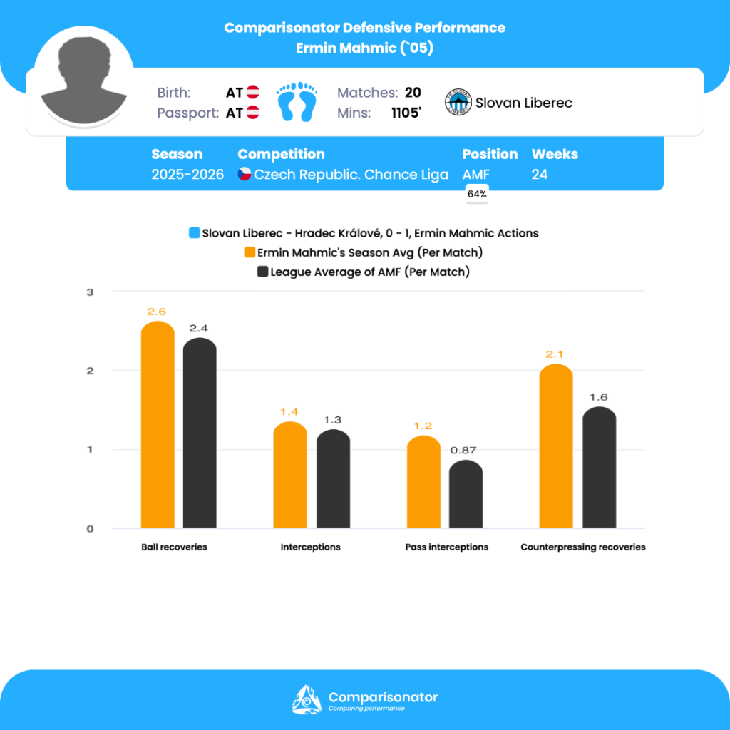 Denis Halinsky’s seasonal profile highlights elite rankings in ball recoveries, defensive actions, successful defensive actions, clearances, and counterpressing recoveries, all within the top two of his positional peer group. These indicators point toward a centre-back who thrives on defensive workload, reading danger, and stabilizing the back line under pressure.