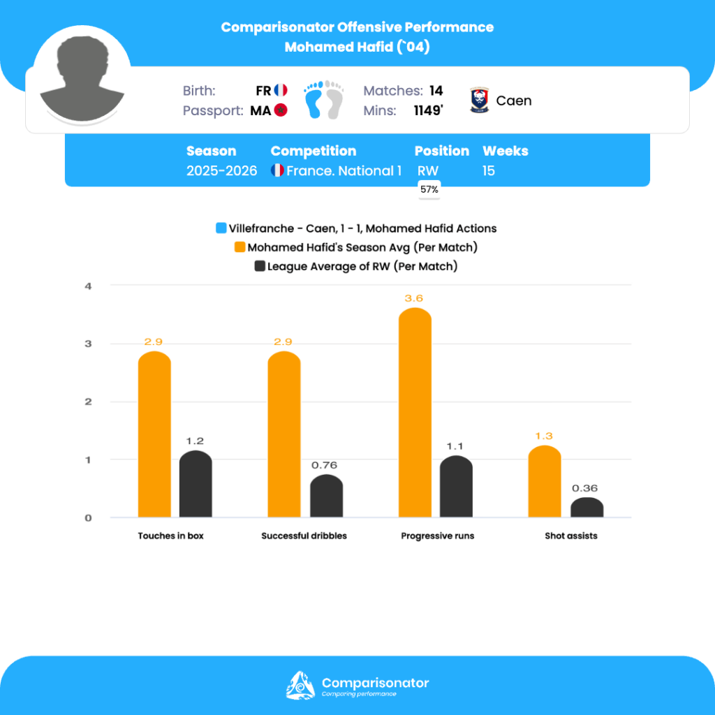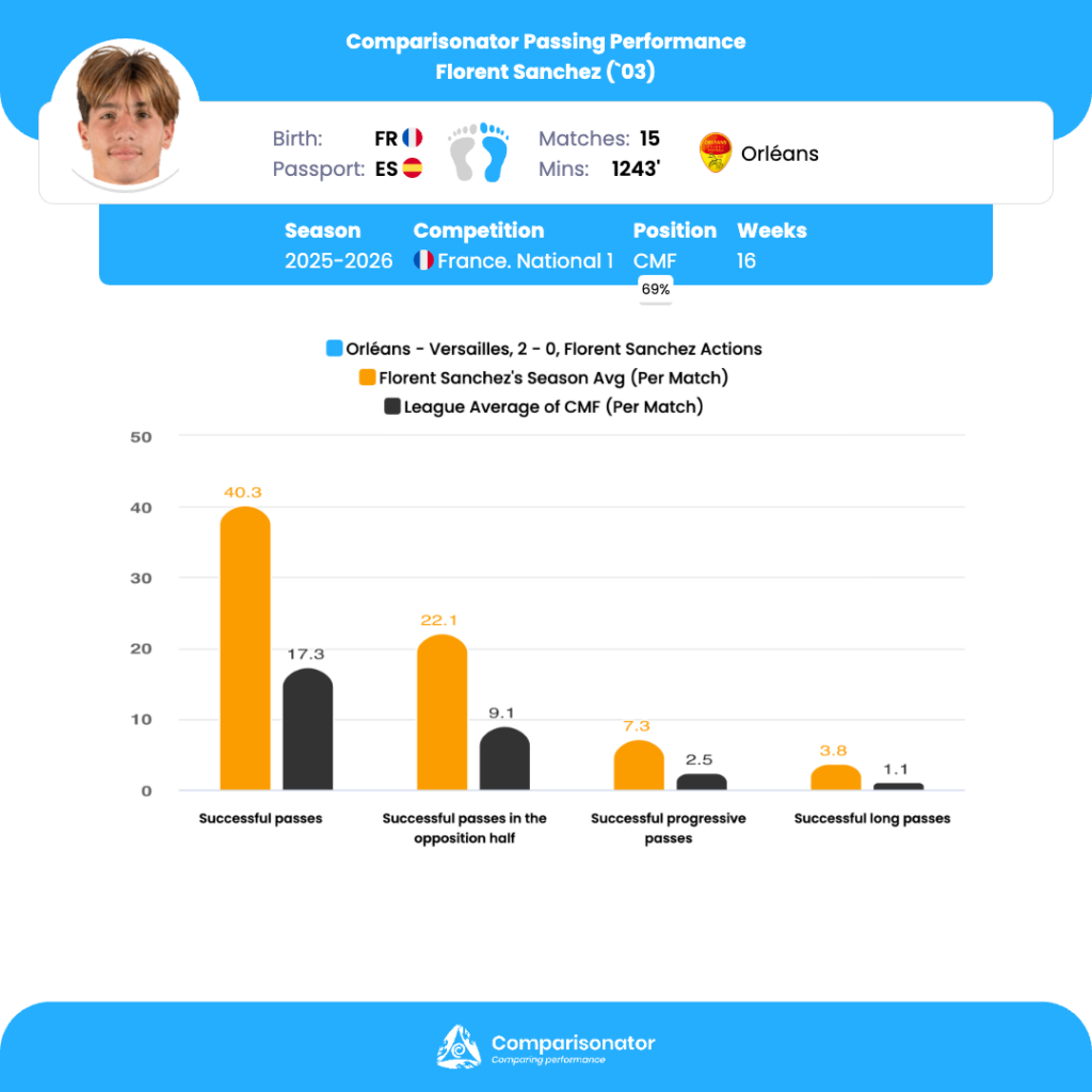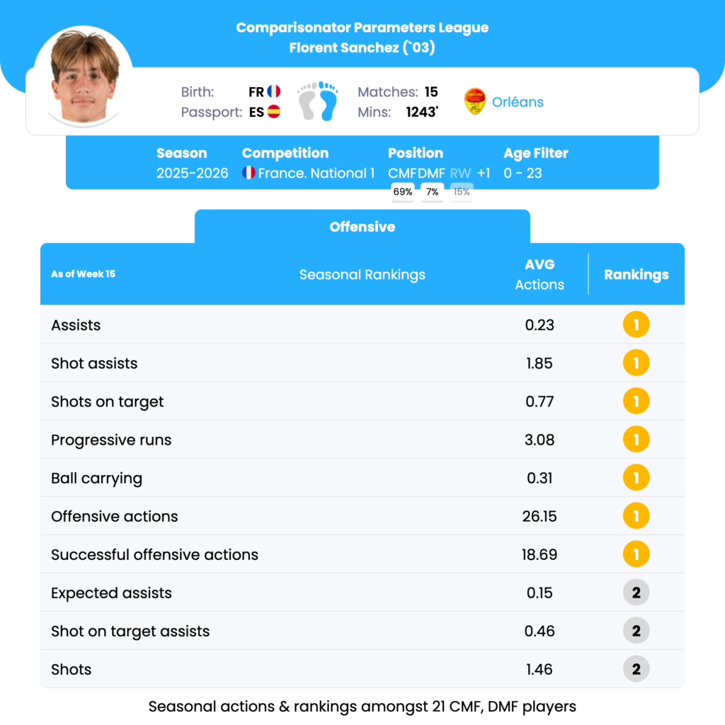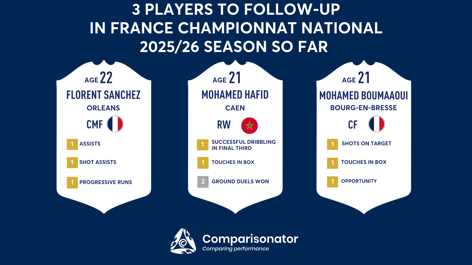As the 2025/26 France Championnat National season progresses, several young talents are making their mark. Here are three standout U23 players who have been turning heads with their performances. Florent Sanchez from Orleans, Mohamed Hafid from Caen and Mohamed Boumaaoui from Bourg-en-Bresse are analyzed based on data from Comparisonator platform. Their impressive statistics highlight their influence on the pitch and their potential for future success.