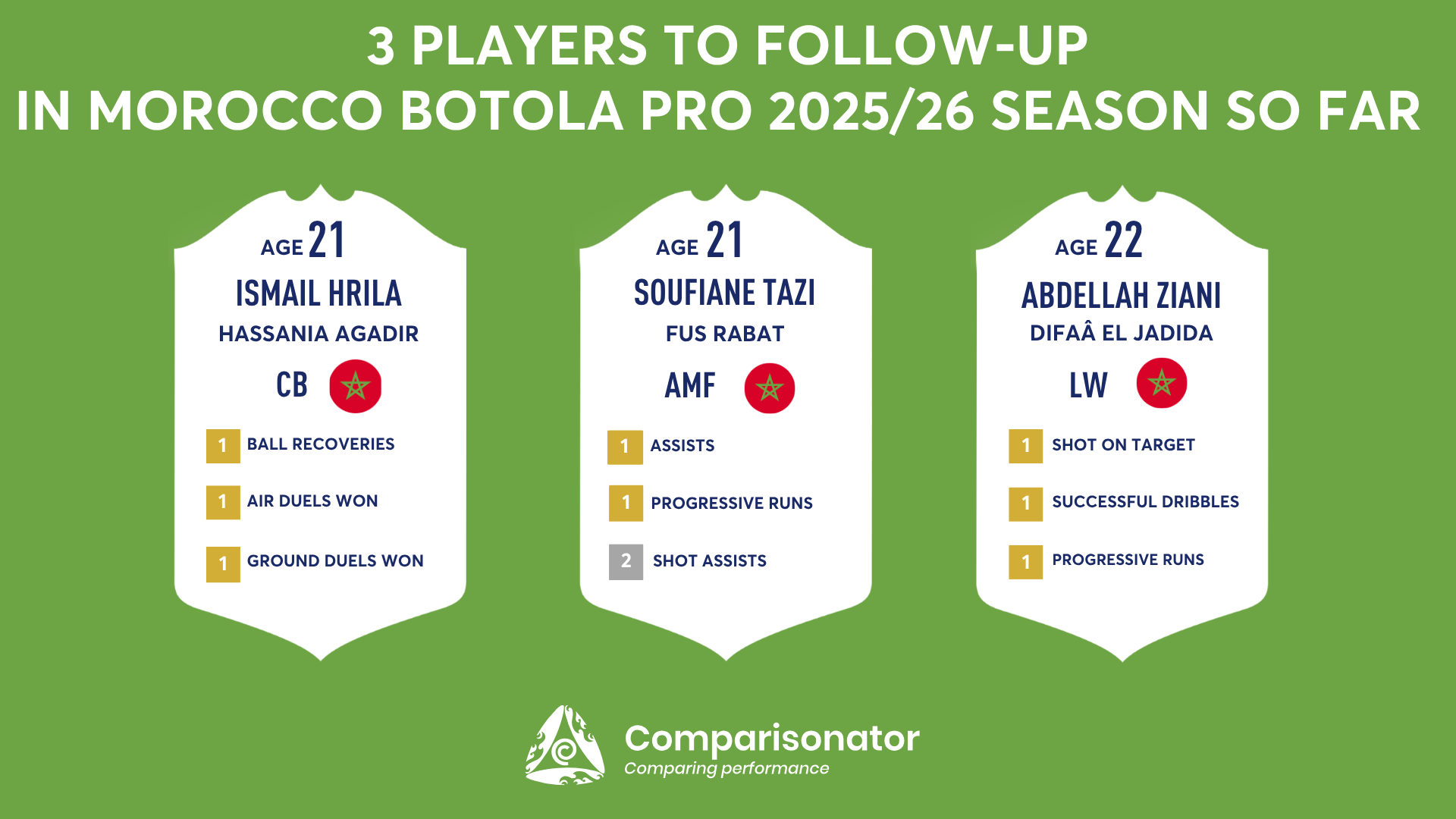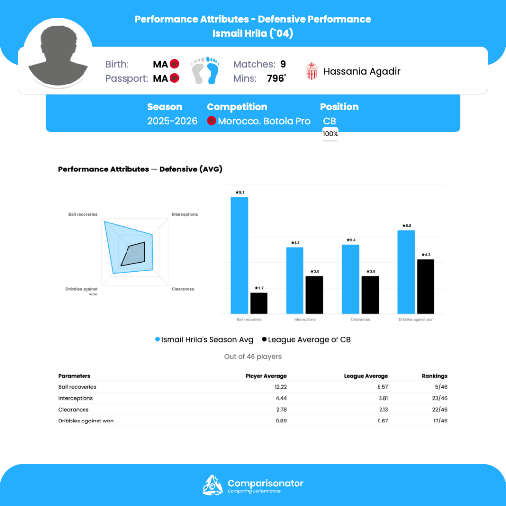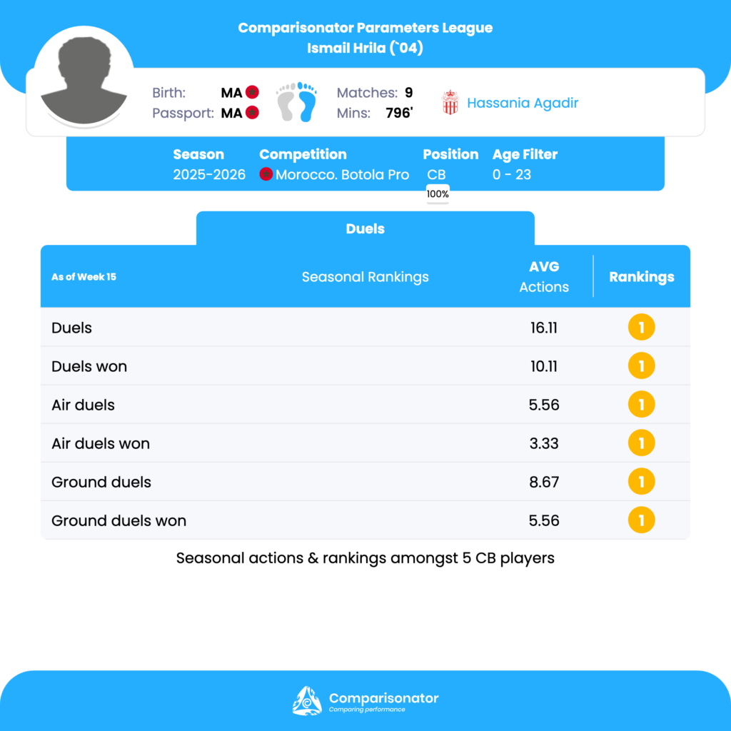 As the 2025/26 Morocco Botola Pro season progresses, several young talents are making their mark. Here are three standout U23 players who have been turning heads with their performances. Ismail Hrila from Hassania Agadir, Soufiane Tazi from FUS Rabat and Abdellah Ziani from Difaa El Jidada are analyzed based on data from Comparisonator platform. Their impressive statistics highlight their influence on the pitch and their potential for future success.