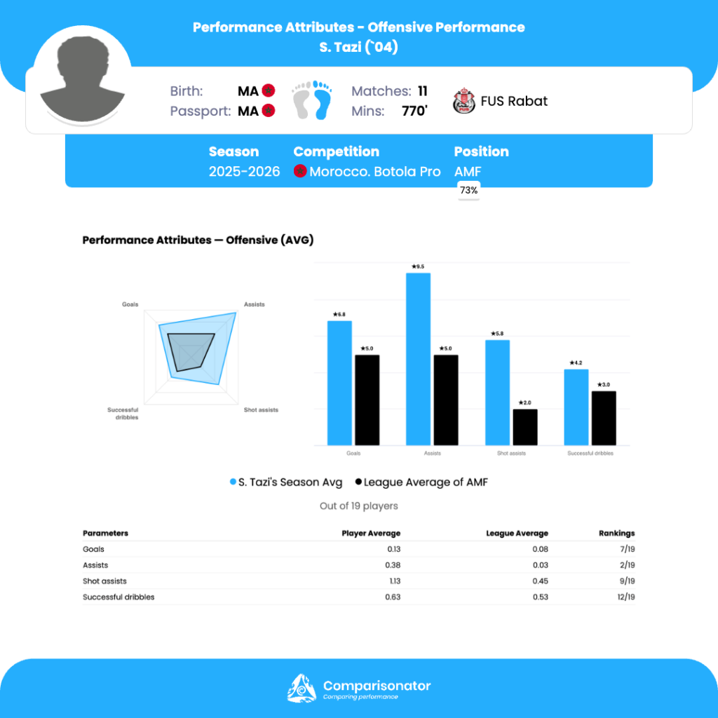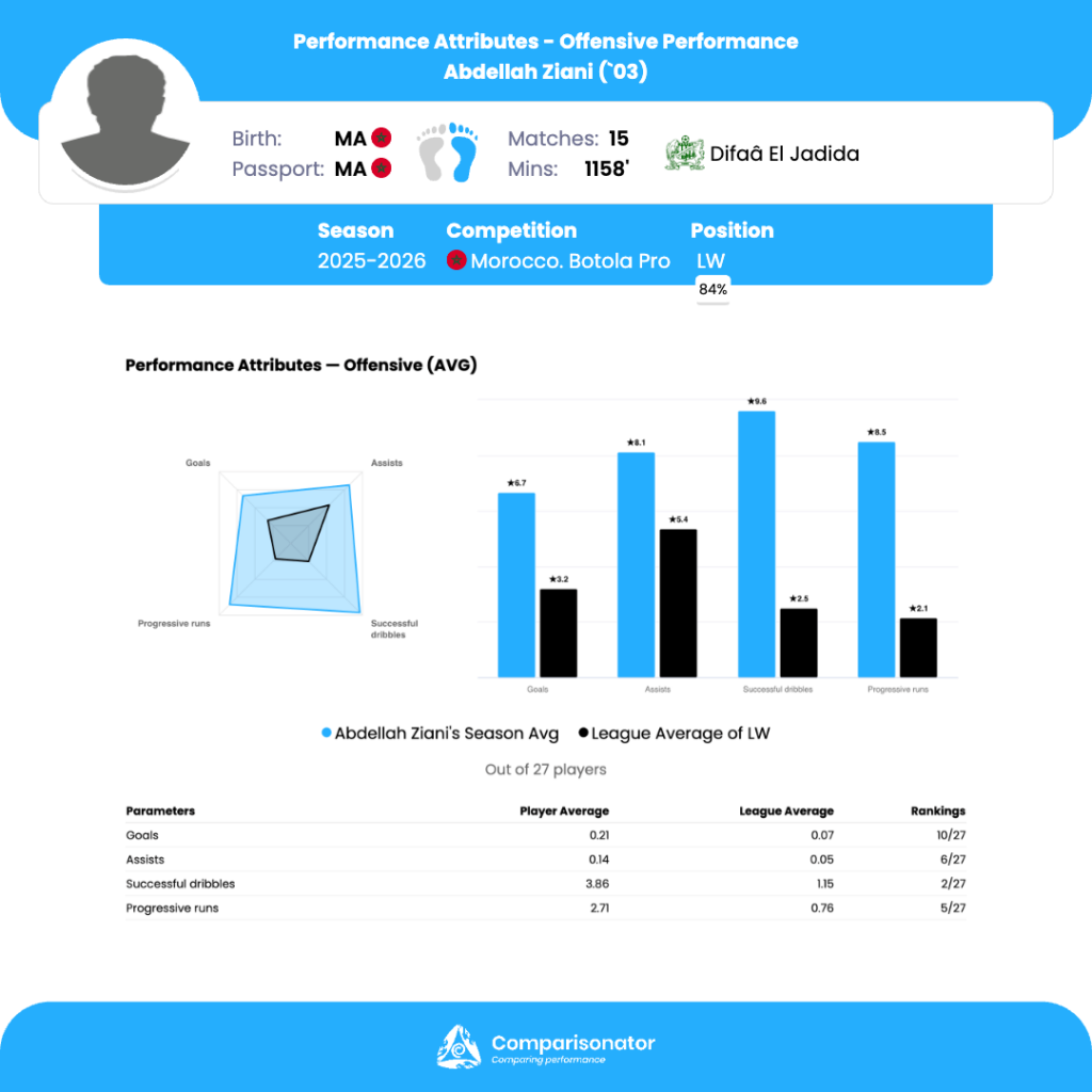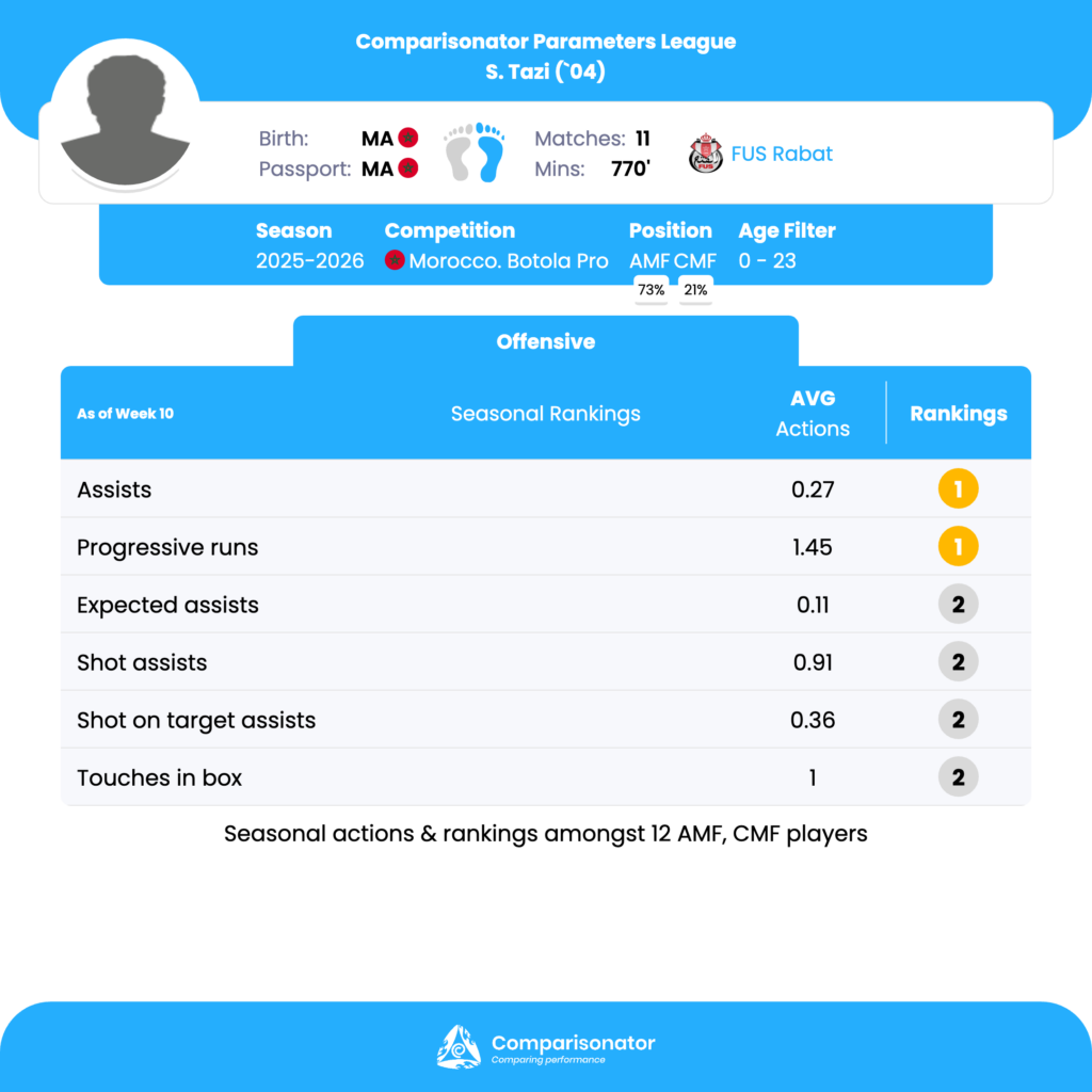 As the 2025/26 Morocco Botola Pro season progresses, several young talents are making their mark. Here are three standout U23 players who have been turning heads with their performances. Ismail Hrila from Hassania Agadir, Soufiane Tazi from FUS Rabat and Abdellah Ziani from Difaa El Jidada are analyzed based on data from Comparisonator platform. Their impressive statistics highlight their influence on the pitch and their potential for future success.