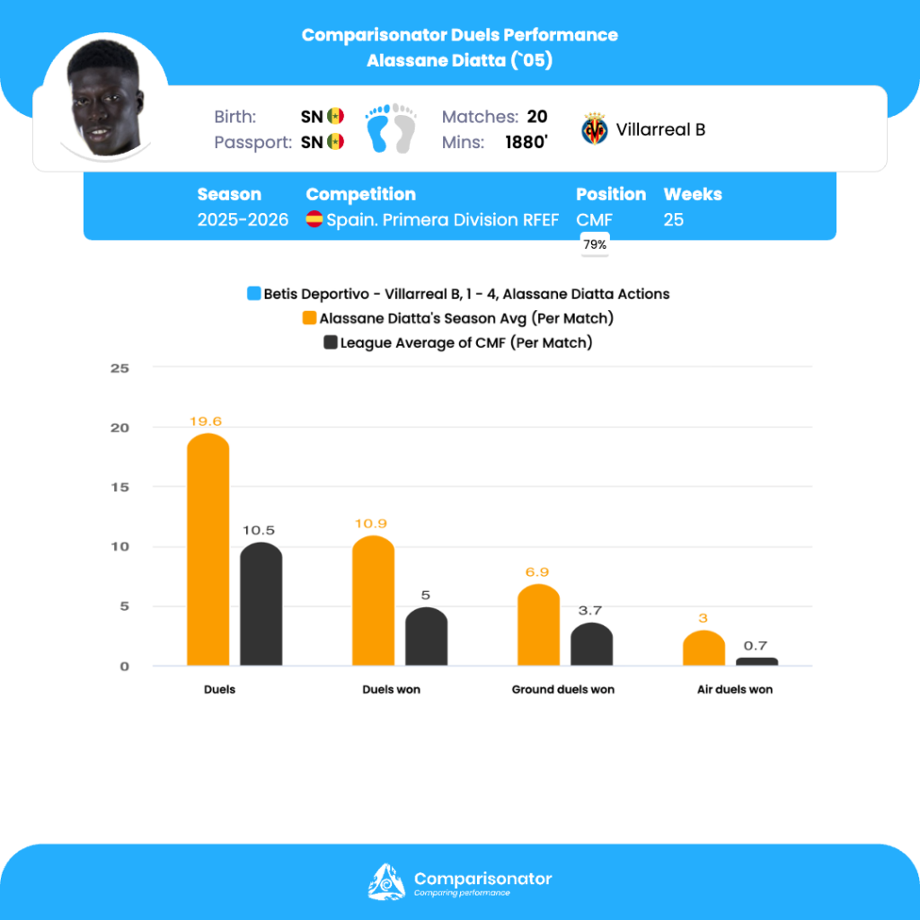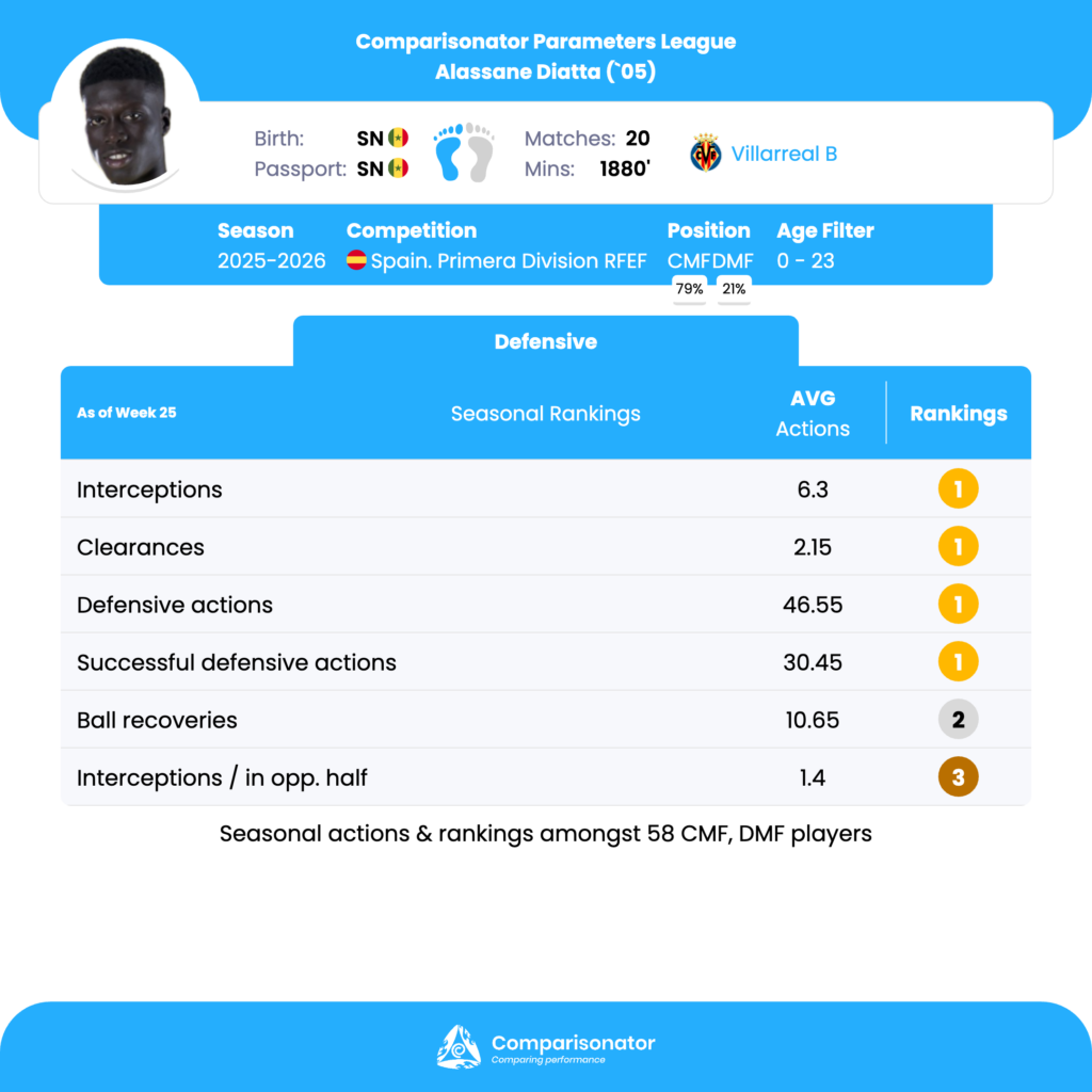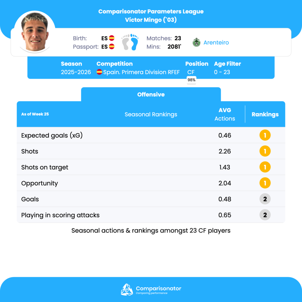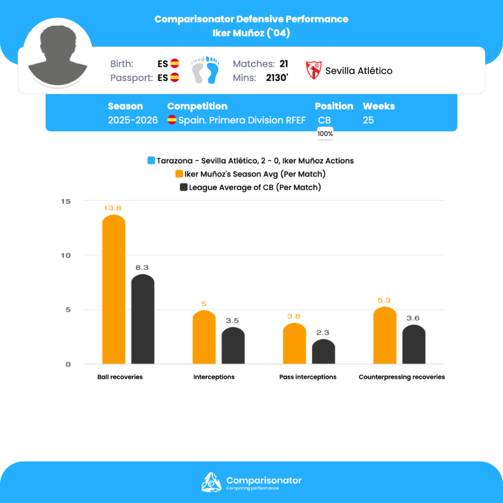 As the 2025/26 Spain Primera Division RFEF season progresses, several young talents are making their mark. Here are three standout U23 players who have been turning heads with their performances. Iker Munoz from Sevilla Atletico, Alassane Diatta from Villarreal B and Victor Mingo from Arenteiro are analyzed based on data from Comparisonator platform. Their impressive statistics highlight their influence on the pitch and their potential for future success.