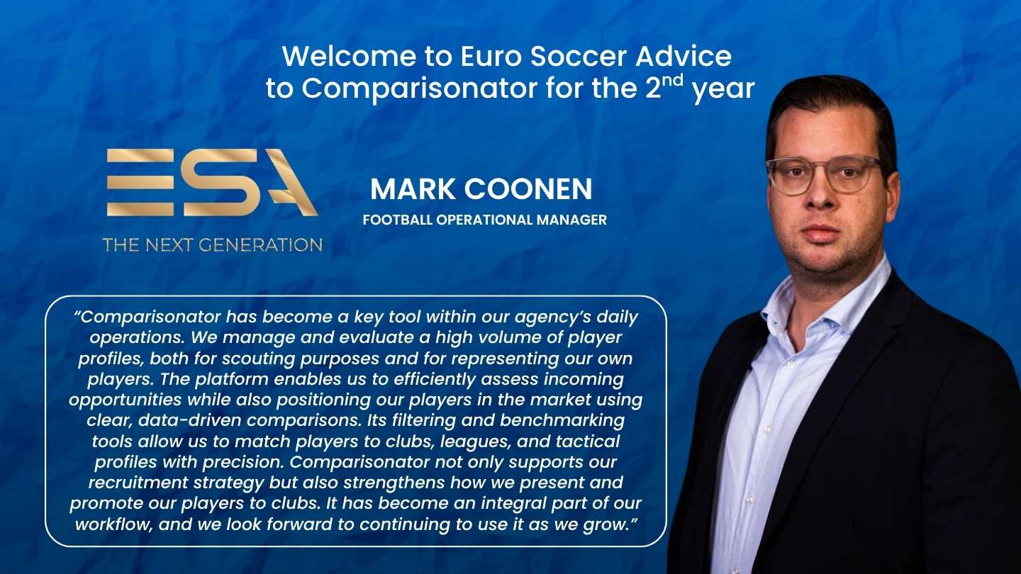 Euro Soccer Advice Football Operational Manager Mark Coonen: โComparisonator has become a key tool within our agencyโs daily operations. We manage and evaluate a high volume of player profiles, both for scouting purposes and for representing our own players.