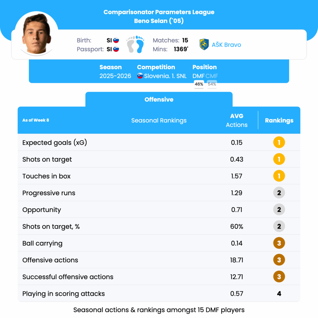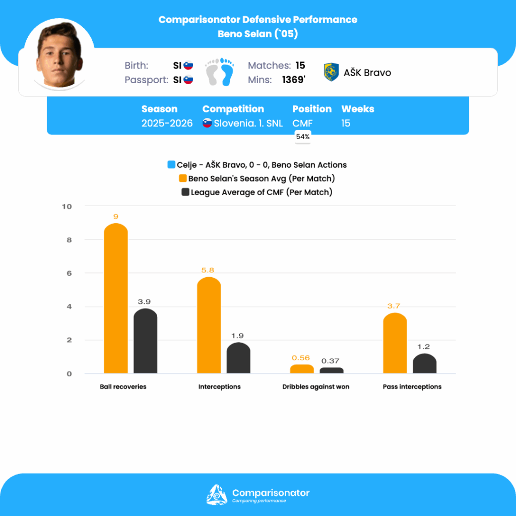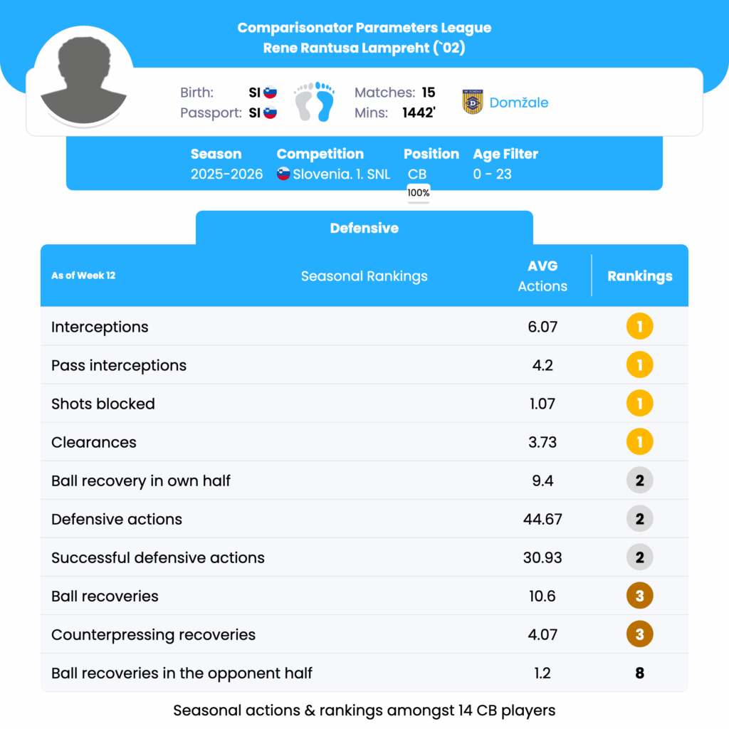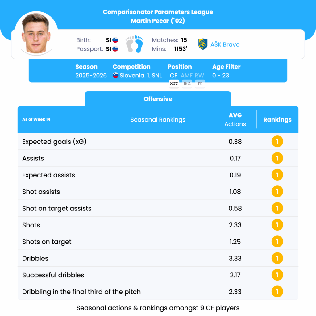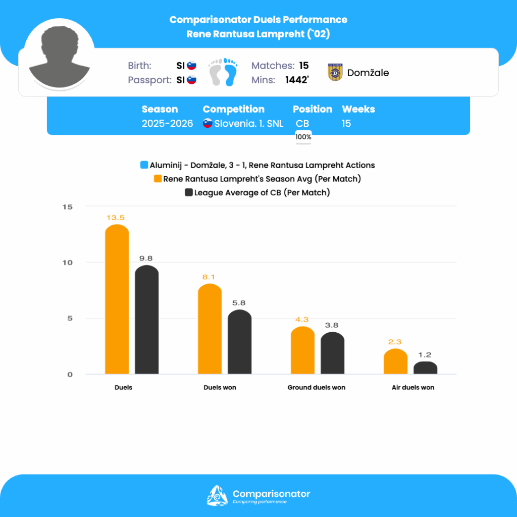 A medida que avanza la 2025/26 Eslovenia 1. SNL, varios jóvenes talentos están dejando huella. He aquí tres destacados jugadores sub23 que han hecho girar cabezas con sus actuaciones. Rene Rantusa Lampreht del Domžale, Beno Selan del AŠK Bravo y Martin Pecar del AŠK Bravo son analizados en base a los datos de la plataforma Comparisonator. Sus impresionantes estadísticas ponen de relieve su influencia sobre el terreno de juego y su potencial para triunfar en el futuro.