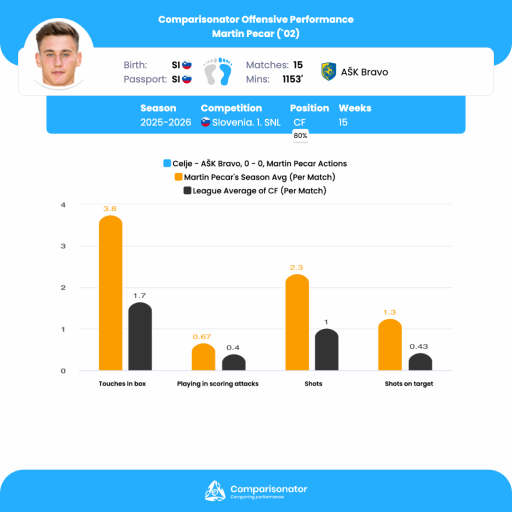 Martin Pecar destaca en la creación y conversión de oportunidades de gol, como demuestran sus primeros puestos en las métricas de goles esperados, asistencias y regates. Aunque su tasa de conversión de tiros a puerta en goles indica que aún puede mejorar, sus contribuciones ofensivas generales le convierten en un valioso activo en escenarios ofensivos. Centrarse en mejorar sus habilidades de remate y su capacidad para lanzar penaltis podría elevar aún más su impacto en el campo.