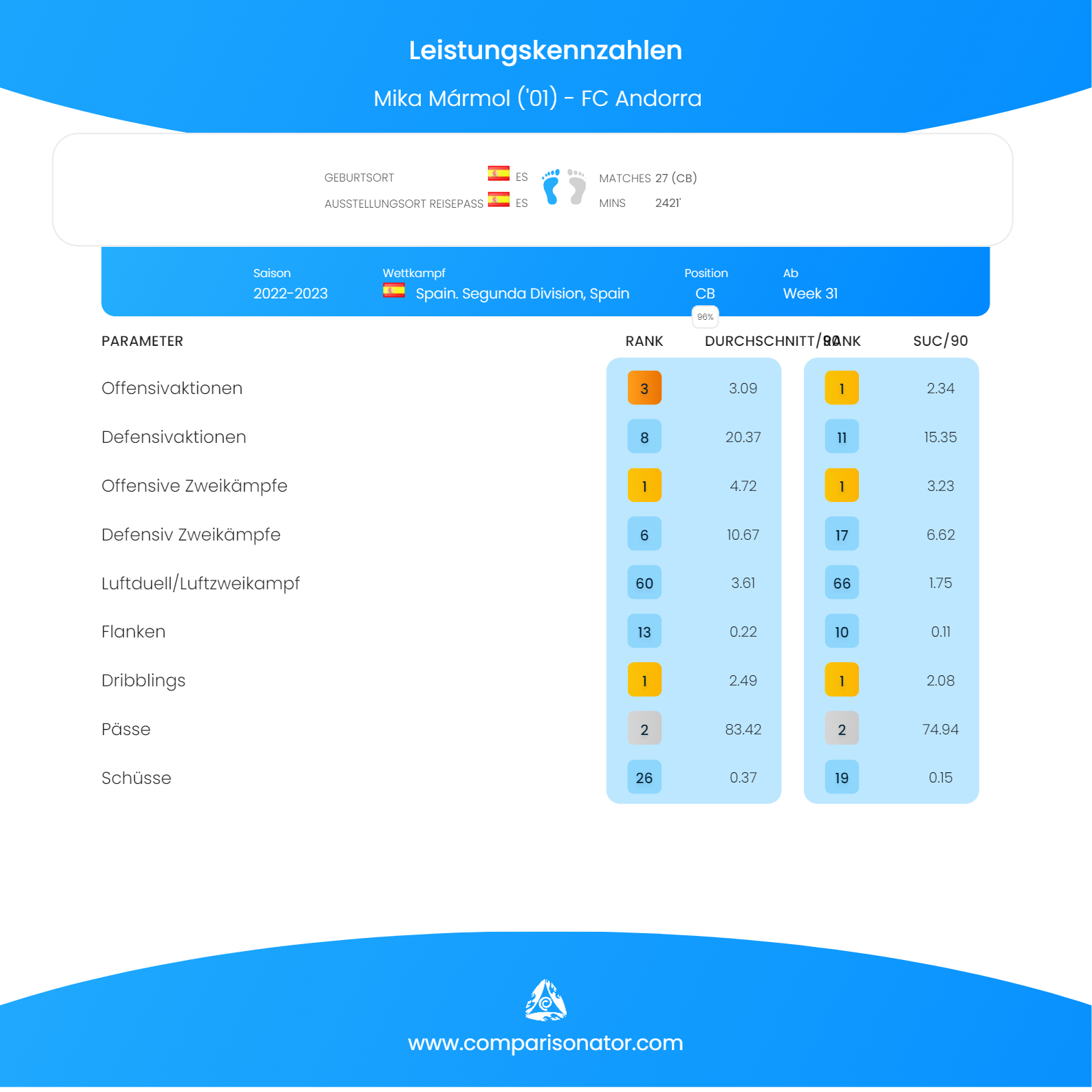Comparisonator ha seleccionado a los 3 mejores jugadores sub23 de la temporada 2022/23 de la Segunda División española. Las puntuaciones de los jugadores están por debajo de sus respectivas posiciones.