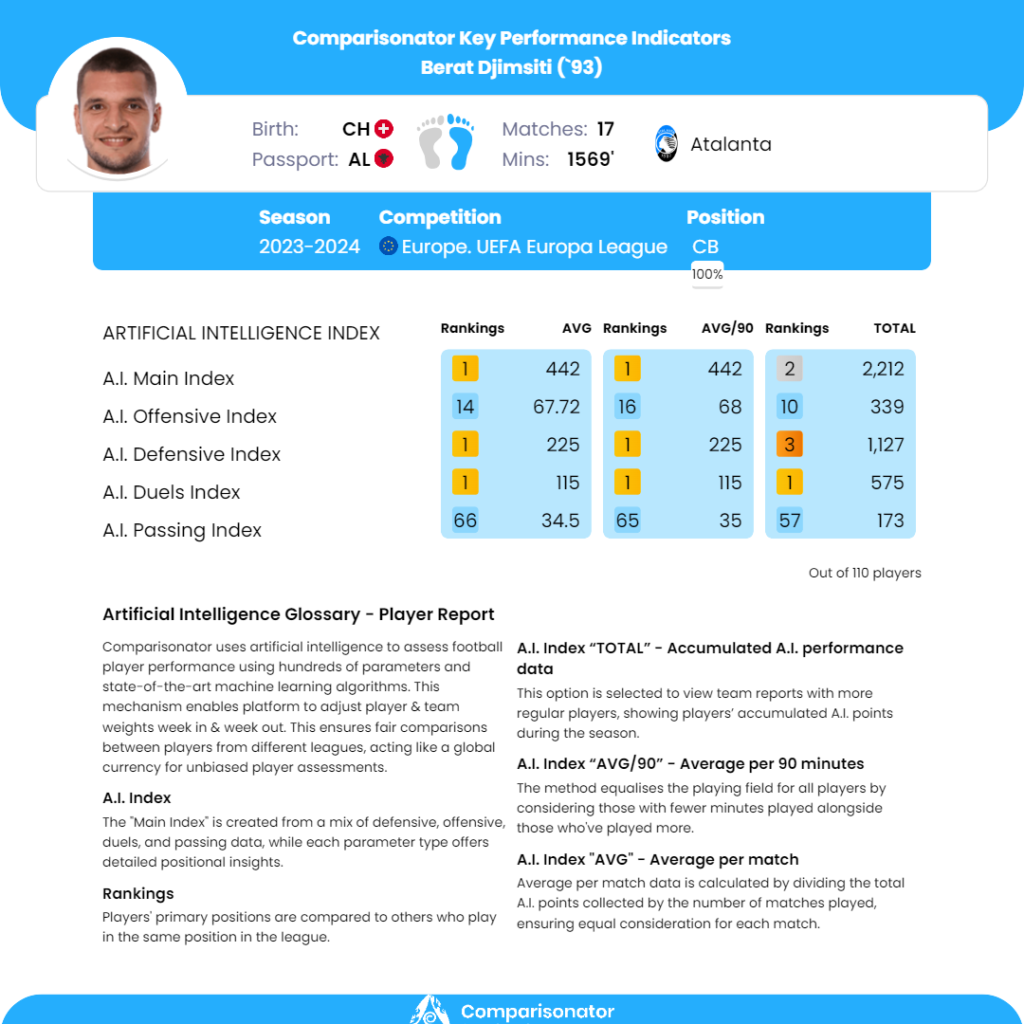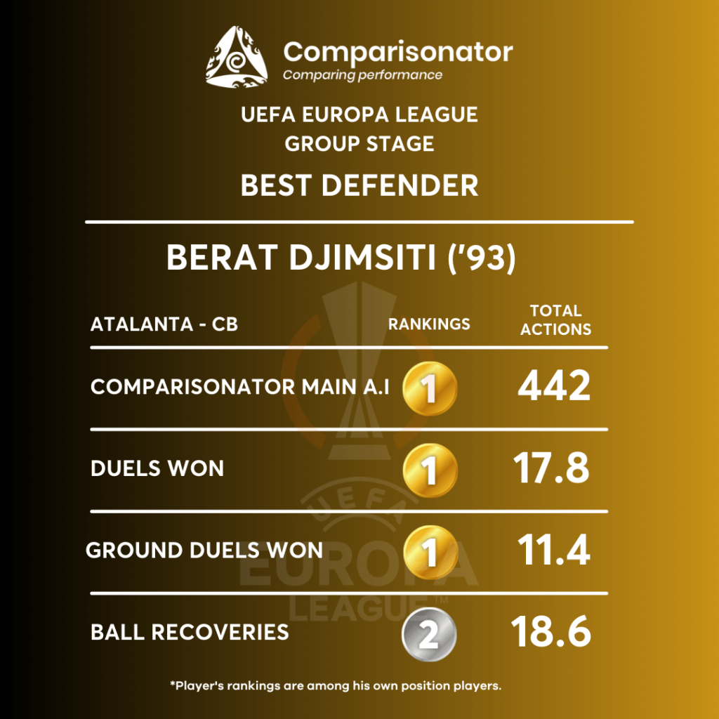 Berat Djimsiti, de l’Atalanta, a été un pilier défensif au cœur de la défense. Avec un indice principal de 442, Djimsiti est en tête des défenseurs centraux pour les duels gagnés (17,8 par match) et les duels au sol gagnés (11,4 par match). Sa capacité à contrecarrer les attaques adverses et à gagner des batailles défensives cruciales a été déterminante pour la solidité de la défense de l’Atalanta pendant la phase de groupe.