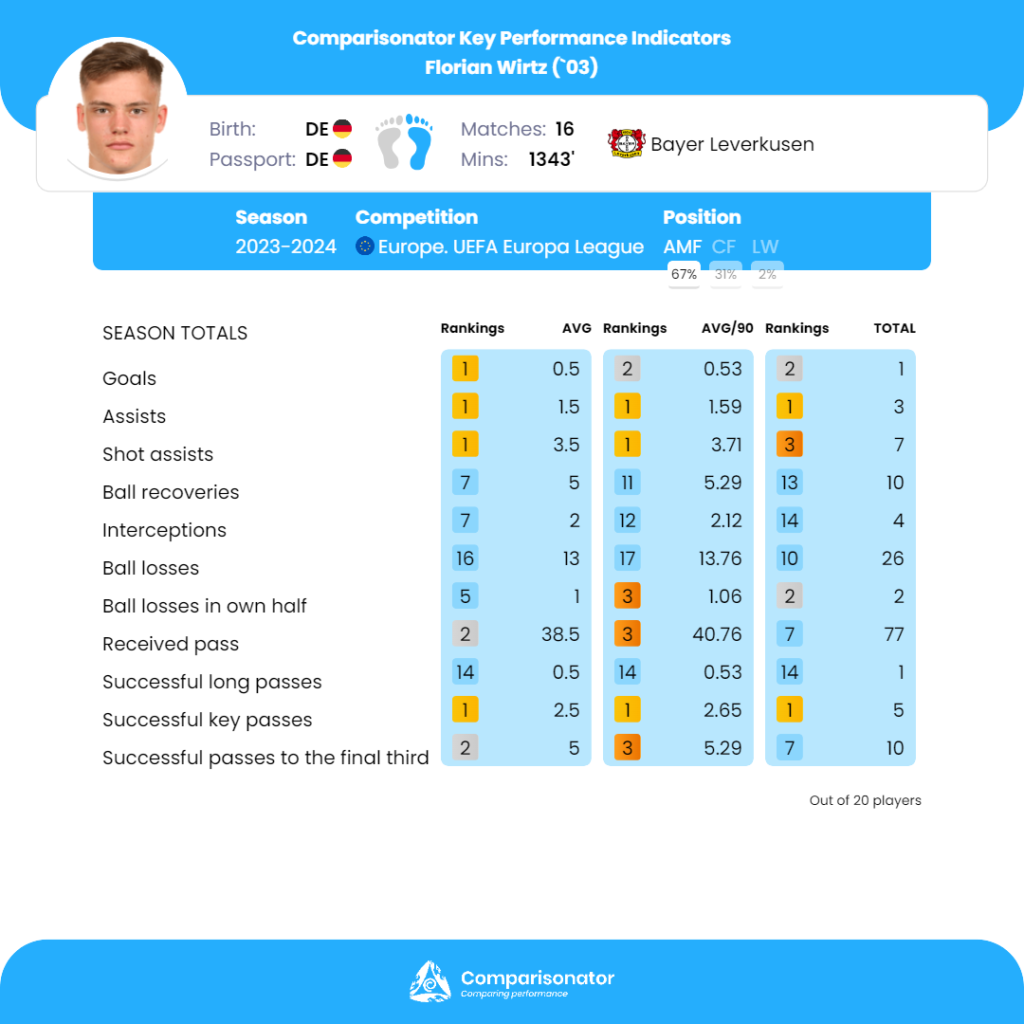 Florian Wirtz, qui évolue au poste de milieu offensif, a été le maestro créatif du Bayer Leverkusen. Doté d’un impressionnant indice principal Comparisonator de 548, Wirtz est en tête des dribbles réussis (4 par match) et des passes décisives (3,5 par match) à son poste. Sa capacité à débloquer les défenses et à contribuer à la fois à la progression du ballon et à la création d’occasions de but fait de lui une figure centrale pour les aspirations du Bayer Leverkusen à l’Europa League.