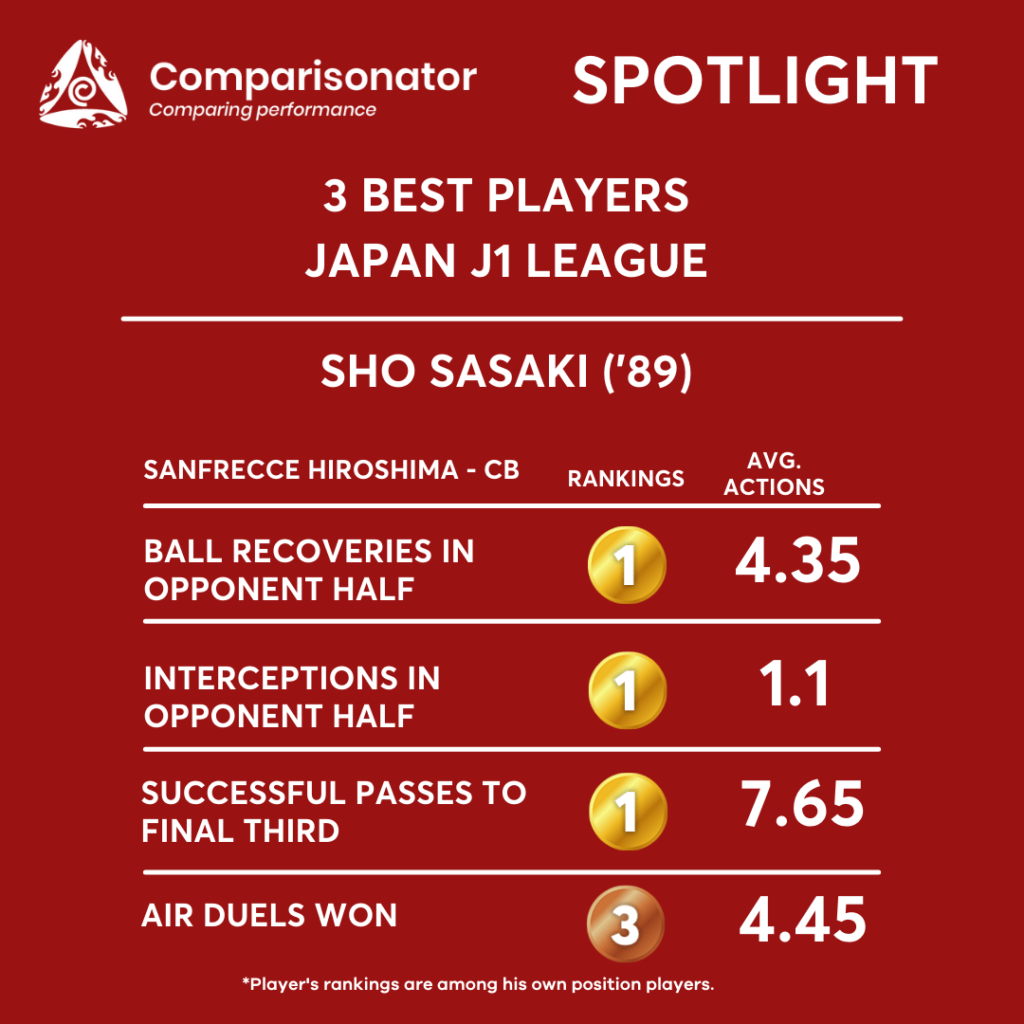 Sho Sasaki, de Sanfrecce Hiroshima, a fait preuve d’excellence défensive au poste de défenseur central, prenant la tête d’un groupe de pairs pour ce qui est des paramètres essentiels. Sasaki se classe premier pour les récupérations de balle dans la moitié de terrain adverse (4,35 par match), les interceptions dans la moitié de terrain adverse (1,1 par match) et les passes réussies dans le dernier tiers (7,65 par match). Sa capacité à initier des attaques depuis l’arrière tout en maintenant une solide présence défensive a été déterminante pour le Sanfrecce Hiroshima.