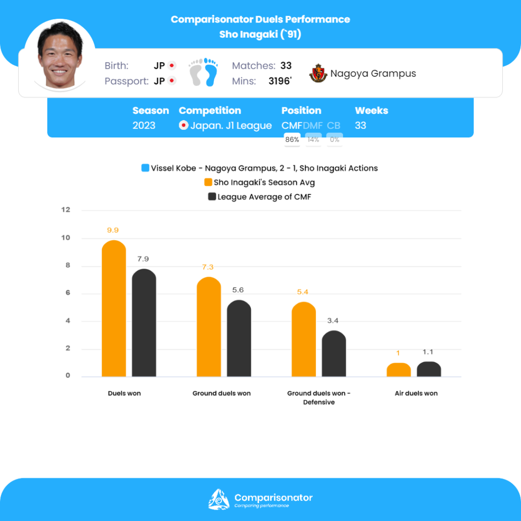 Sho Inagaki, de Nagoya Grampus, a été un pilier du milieu de terrain, excellant dans les récupérations de balle (11,19 par match), les duels au sol gagnés (7,81 par match) et les duels défensifs au sol gagnés (5,84 par match). En tant que milieu de terrain central, Inagaki a su gagner la possession du ballon et les duels, ce qui a permis à Nagoya Grampus de se doter d’une base solide au milieu du terrain.