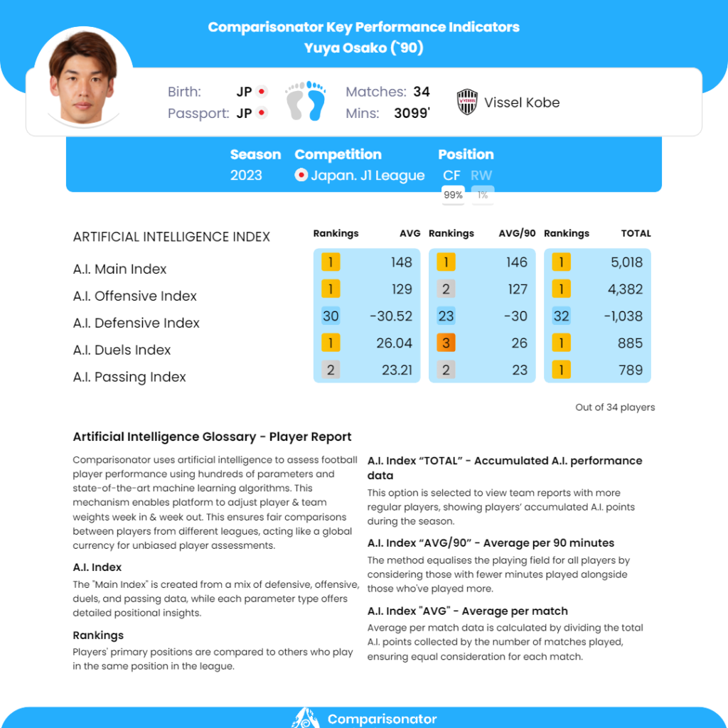 Yuyo Osako, du Vissel Kobe, a mené la ligne avec une efficacité clinique, se classant premier pour les buts (0,65 par match), les passes décisives (1,24 par match) et les duels au sol gagnés (6,09 par match) parmi les attaquants centraux. Les prouesses d’Osako en matière de buts et sa capacité à contribuer au jeu de construction font de lui un élément clé des stratégies offensives du Vissel Kobe.