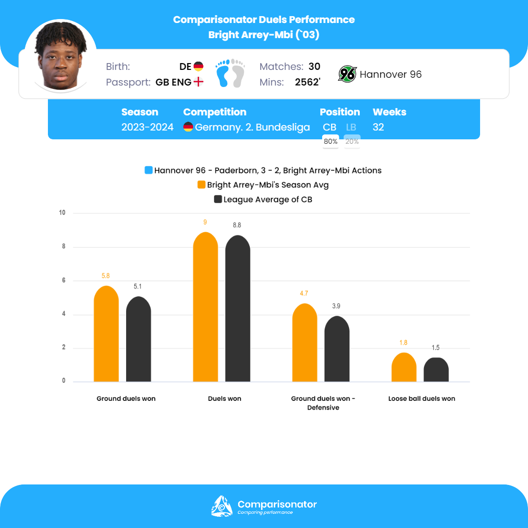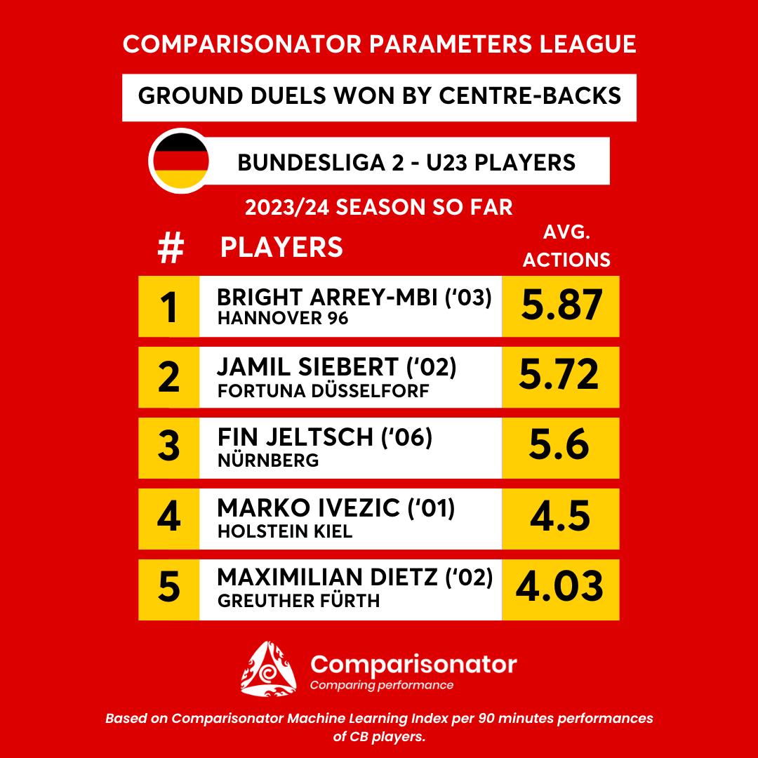 브라이트 아레이-엠비는 90분당 5.87개의 공중볼 경합에서 승리하며 23세 이하 센터백을 이끌고 있으며, 뛰어난 피지컬과 수비력을 선보이고 있습니다. 자밀 시버트, 핀 젤치, 마르코 이베지치, 막시밀리안 디에츠도 수비에서 중요한 전투에서 승리하는 능력을 보여주며 팀에 탄탄한 기반을 제공했습니다.