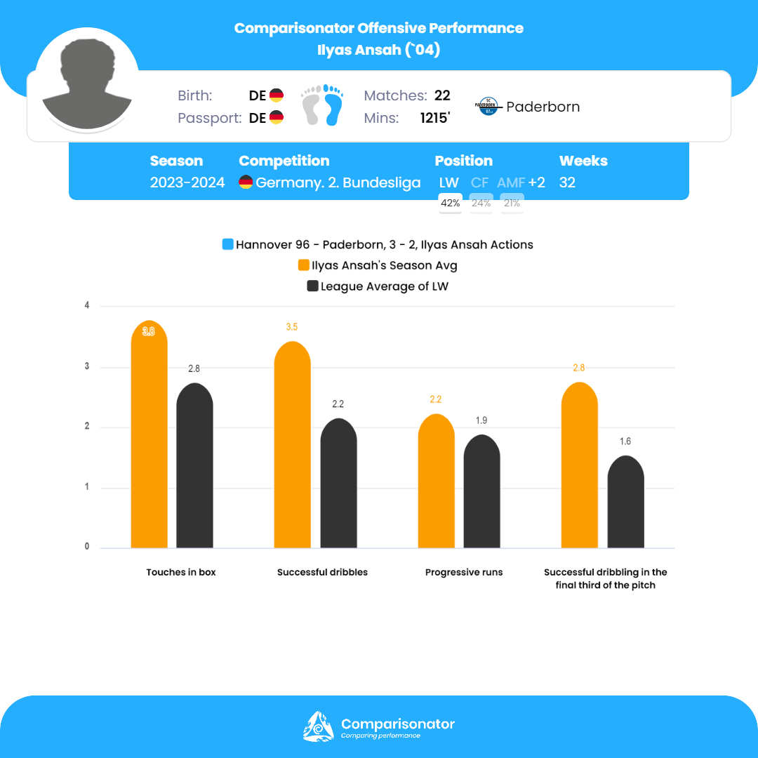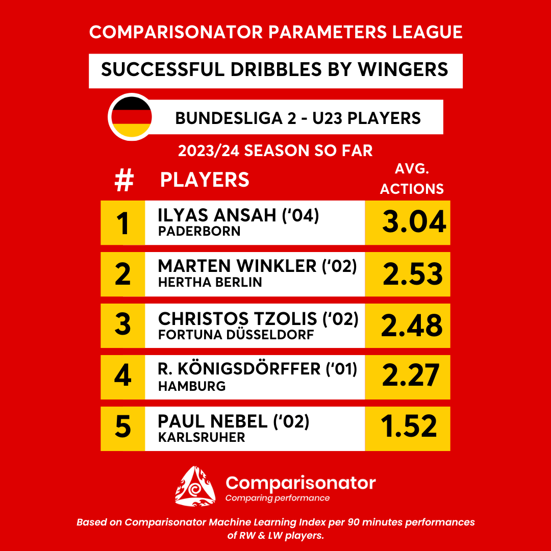 일리아스 안사는 90분당 3.04회의 드리블 성공 횟수로 23세 이하 윙어 중 1위를 차지했습니다. 공을 다루는 기술과 민첩성을 바탕으로 상대 수비수를 효과적으로 우회할 수 있습니다. 마르텐 윙클러, 크리스토스 촐리스, 랜스포드 쾨니히스도르퍼, 폴 네벨도 수비수를 제치고 득점 기회를 창출하는 능력이 뛰어납니다.