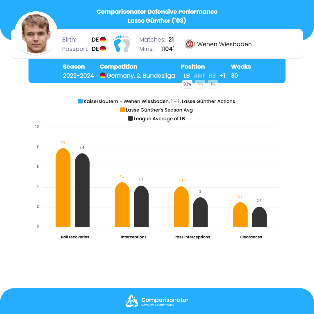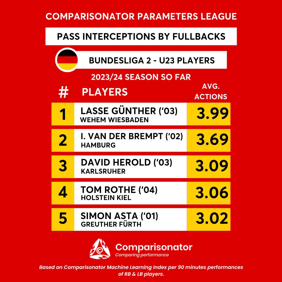 라세 귄터는 90분당 3.99개의 패스 차단으로 23세 이하 풀백 부문에서 선두를 달리고 있으며, 수비 인식과 상대 공격을 방해하는 능력을 선보이고 있습니다. 이그나스 반 데 브렘프, 데이비드 헤롤드, 톰 로테, 사이먼 아스타도 경기 판독과 패스를 가로채 팀의 소유권을 되찾는 데 탁월한 능력을 발휘합니다.