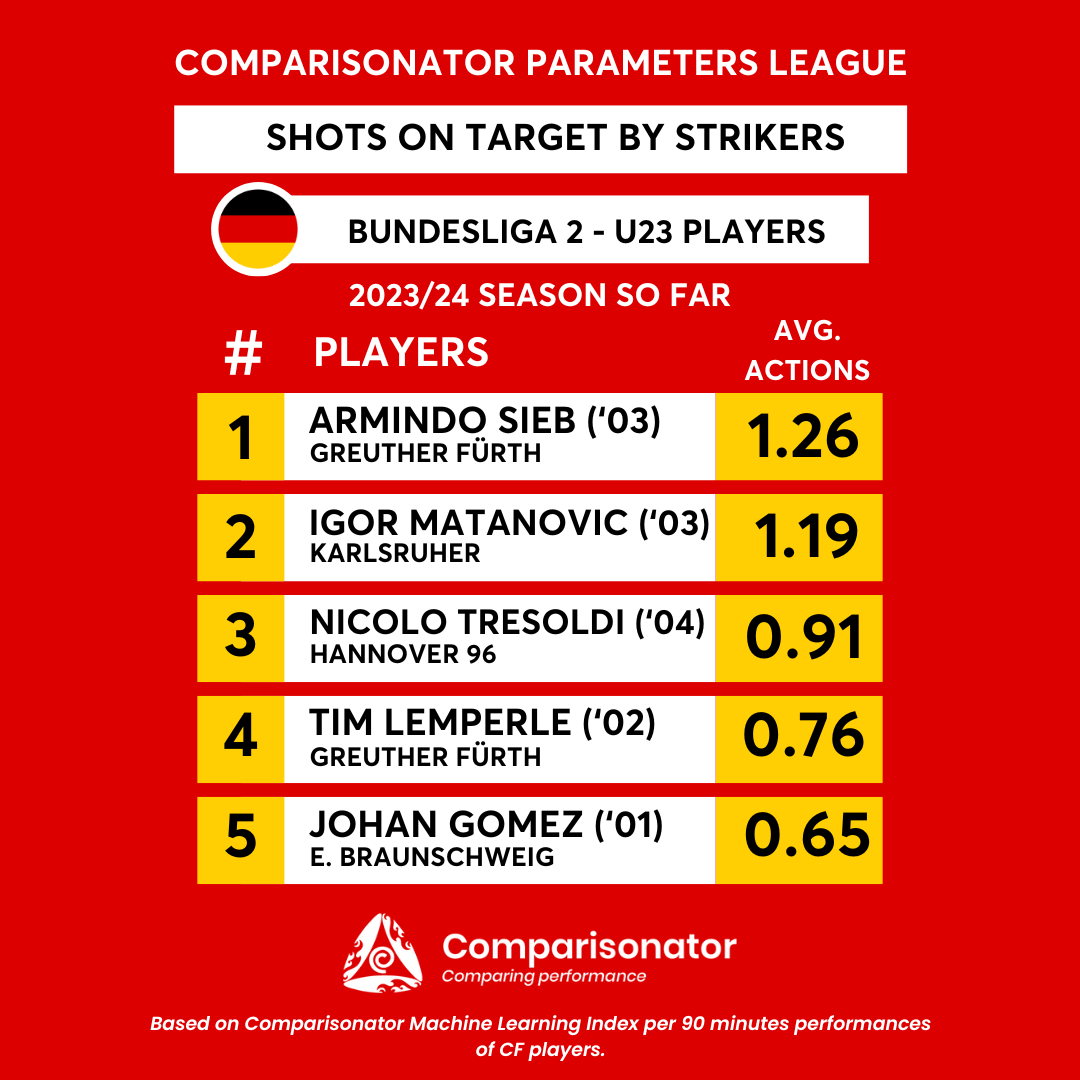 아르민도 시브는 90분당 1.26개의 슈팅으로 23세 이하 공격수 부문에서 선두를 달리며 임상적인 마무리 능력을 보여주고 있습니다. 이고르 마타노비치, 니콜로 트레솔디, 팀 렘페레, 요한 고메즈도 정확한 슈팅으로 골키퍼를 시험하는 능력으로 상대 수비진을 끊임없이 위협하고 있습니다.