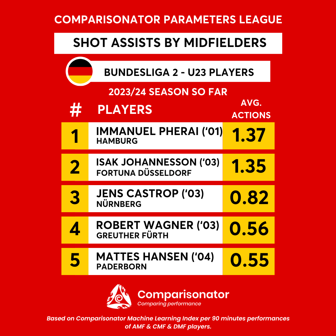 임마누엘 페라이는 90분당 1.37개의 슈팅 어시스트로 23세 이하 미드필더 부문에서 선두를 달리고 있으며, 이삭 요하네슨이 그 뒤를 바짝 쫓고 있습니다. 두 선수의 득점 기회 창출 능력은 성공적인 미드필더의 필수 자질인 시야와 플레이 메이킹 능력을 잘 보여줍니다.