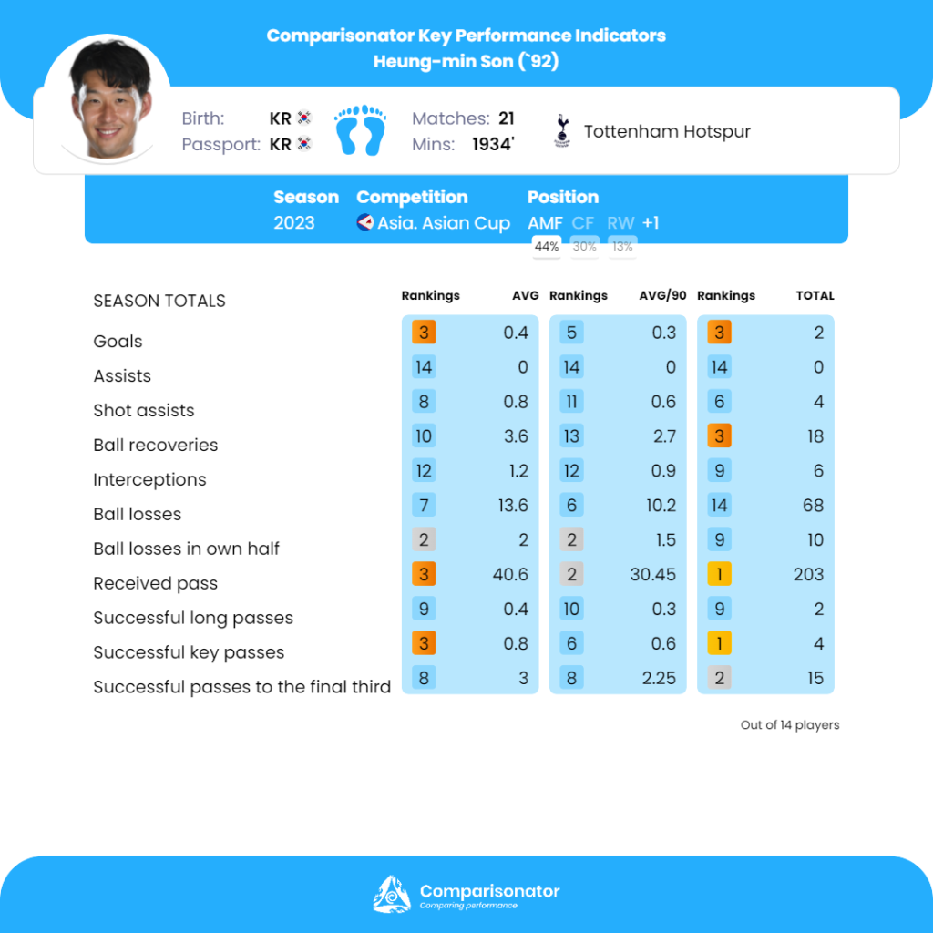 Güney Koreli Heung-Min Son, hücuma dönük orta saha oyuncusu pozisyonunda hücumdaki hünerlerini sergileyerek şut, kaleyi bulan şut ve beklenen gol (XG) sayılarında lider oldu. Son’un gol atma tehdidi ve yaratıcılığı Güney Kore’nin hücum stratejilerinde çok önemli bir rol oynadı ve turnuva boyunca rakip savunmaları diken üstünde tuttu.