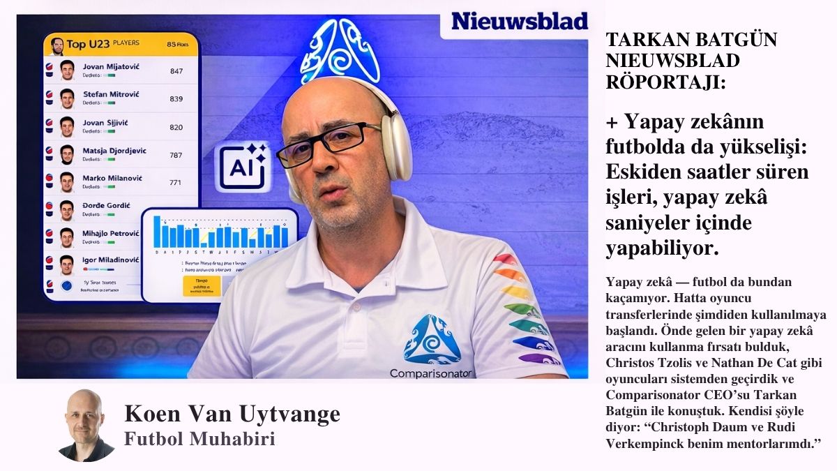 Yapay zekâ — futbol da bundan kaçamıyor. Hatta oyuncu transferlerinde şimdiden kullanılmaya başlandı. Önde gelen bir yapay zekâ aracını kullanma fırsatı bulduk, Christos Tzolis ve Nathan De Cat gibi oyuncuları sistemden geçirdik ve Comparisonator CEO’su Tarkan Batgün ile konuştuk. Kendisi şöyle diyor: “Christoph Daum ve Rudi Verkempinck benim mentorlarımdı.”